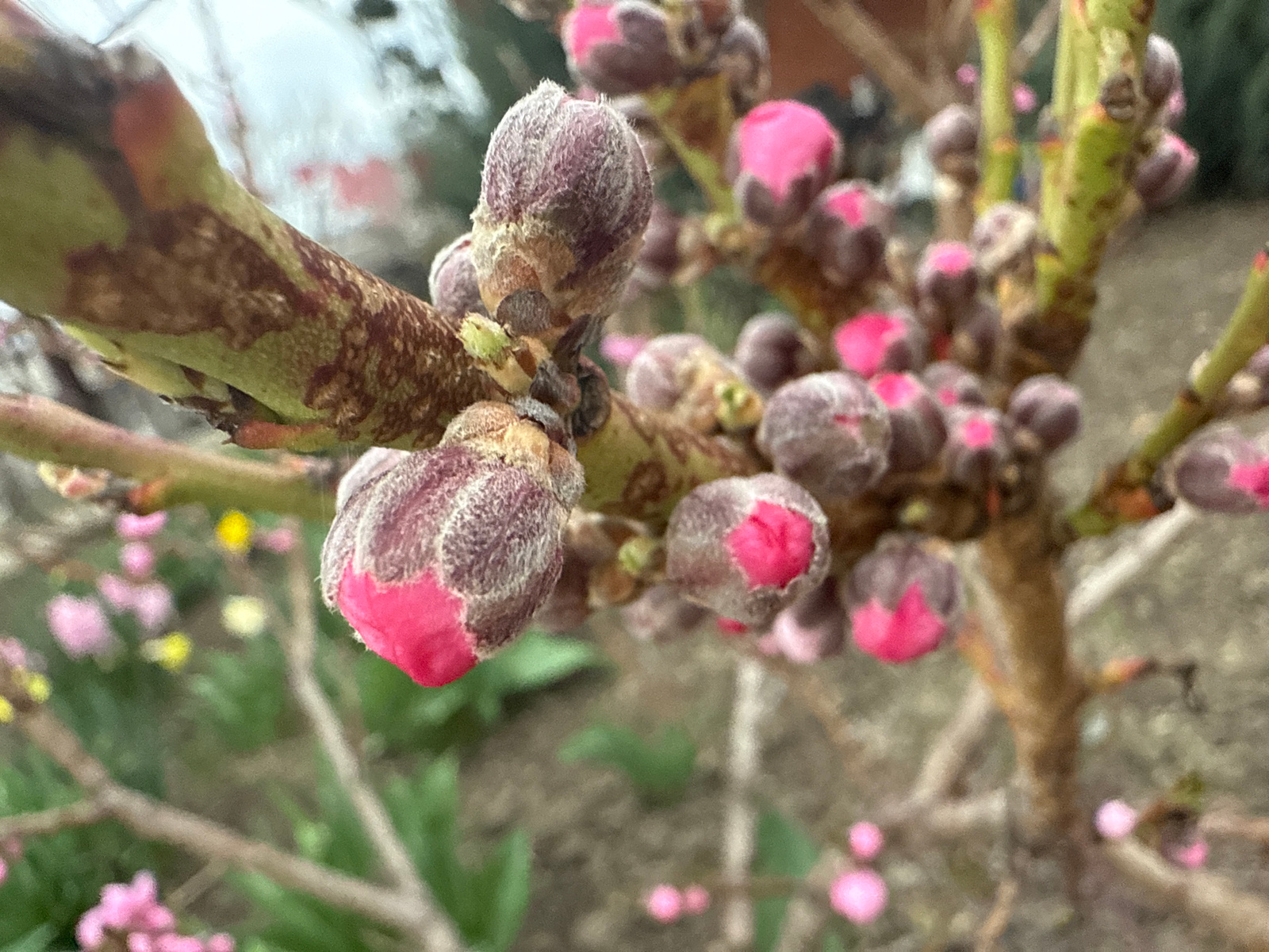 The image shows a close-up of a tree branch in the city of Maykop, Russia. The branch is covered in numerous flower buds, most of which are still closed. The buds have a fuzzy, reddish-brown outer lay…read more