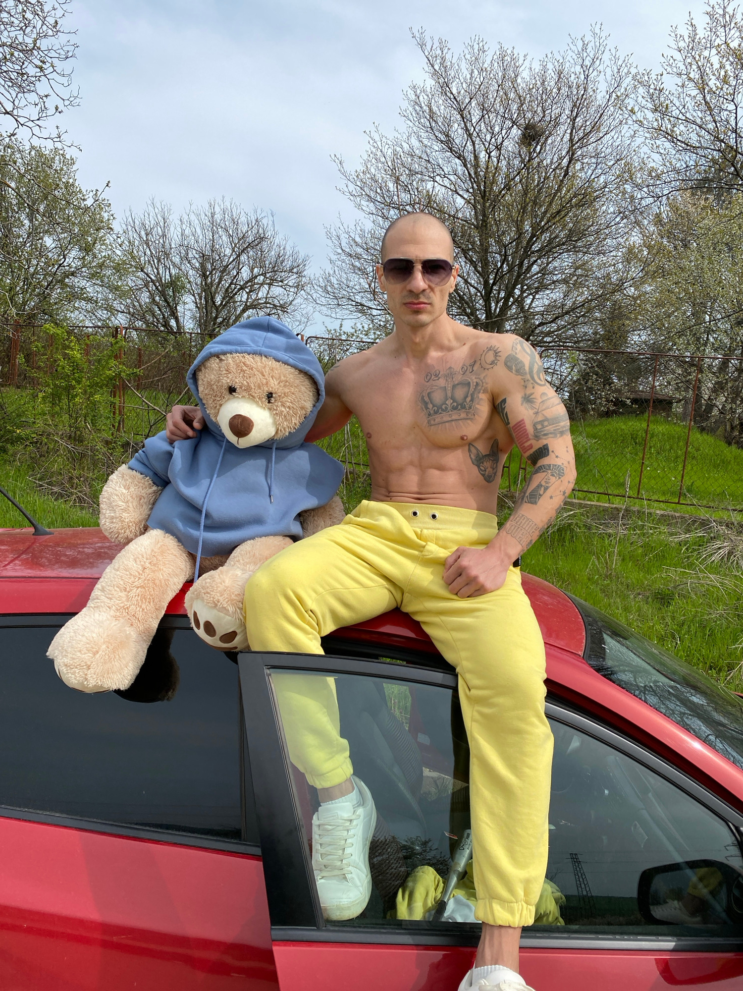 A shirtless man with sunglasses and yellow pants poses on a red car next to a teddy bear wearing a blue hoodie. The man is muscular and has multiple tattoos on his arms and chest. The car is parked in…read more