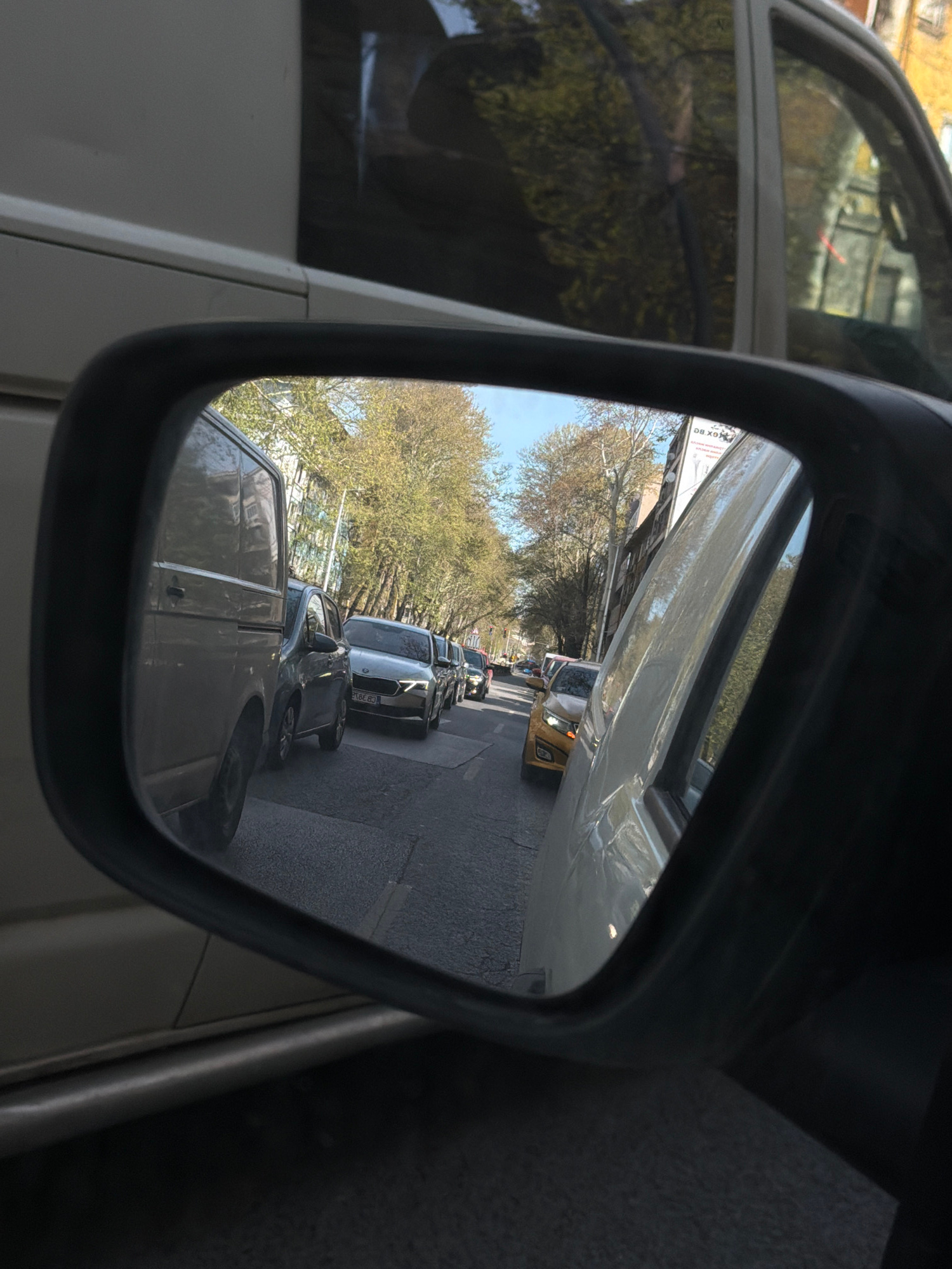 The image displays a vehicle's side mirror, which is centrally framed and appears vertically oriented within the rotated photograph. The reflection inside the mirror shows a street scene laid out hori…read more