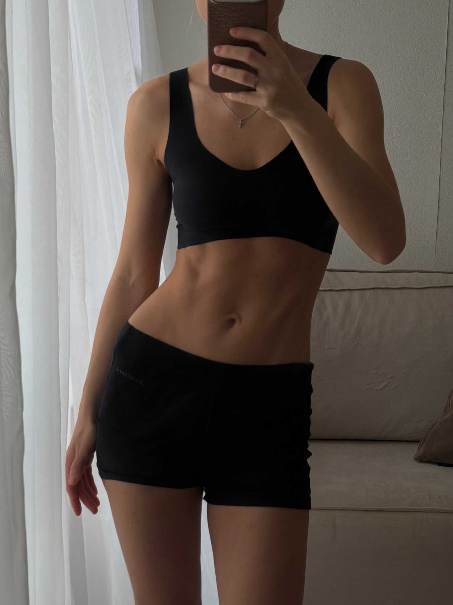 A woman in a black sports bra and black shorts is taking a selfie in a mirror. She is holding a phone in her left hand, obscuring part of her face. The background includes a white wall, a white curtai…read more