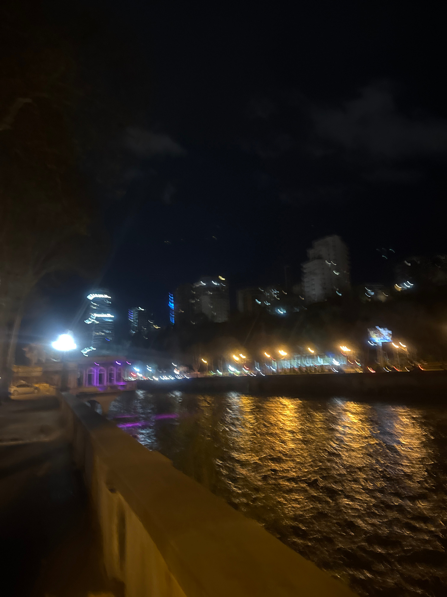 The image depicts a night scene in Tbilisi, Georgia, likely taken from a bridge. The right side of the image shows a concrete structure, possibly the bridge's barrier, with textured, golden light refl…read more