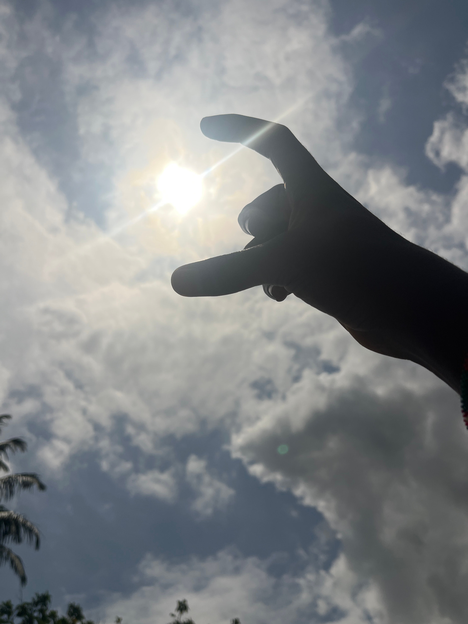 The image presents a dramatic low-angle shot of a person's hand silhouetted against a bright, cloudy sky. The hand, belonging to an adult, is positioned in the upper central area, held up or reaching…read more