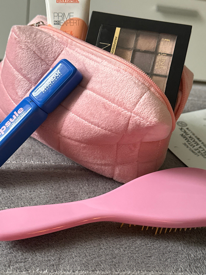 The image displays a collection of cosmetic and personal care items arranged on a grey, textured fabric surface in an indoor setting. The precise city and location within "Unknown, Unknown" are not id…read more