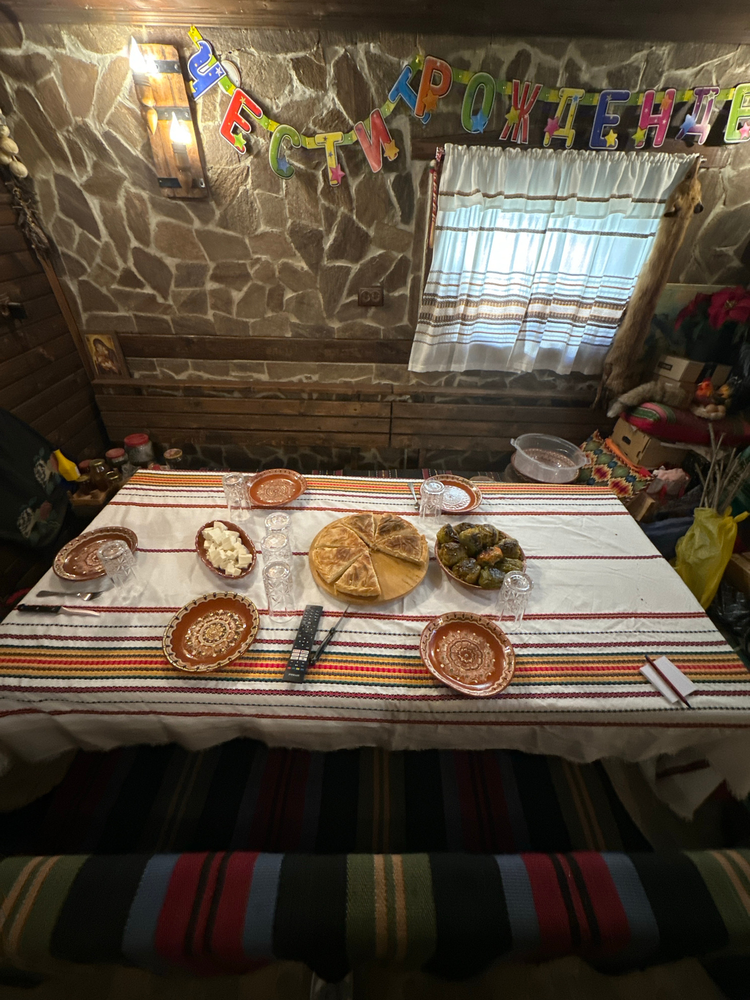 The image shows a festive table setting in what appears to be a traditional Bulgarian home, likely in or near Berkovitsa, Bulgaria, given the context of the prompt. A long table, covered with a stripe…read more