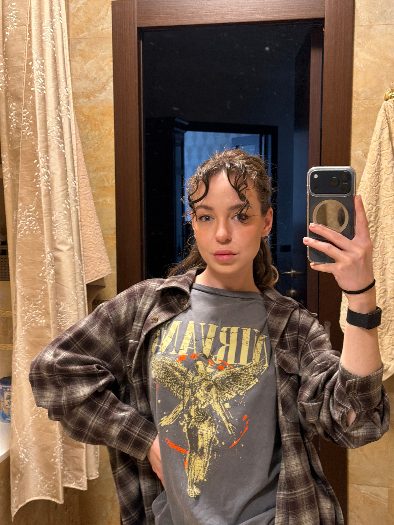 A person is taking a selfie in a bathroom. The person has brown, curly hair that is wet and slicked back. The person is wearing a gray graphic t-shirt, a brown and white plaid flannel shirt, and a bla…read more