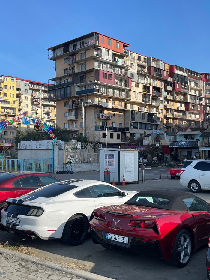 This image depicts an urban scene in Batumi, Georgia, characterized by dense residential architecture and a foreground parking area. The primary subjects in the foreground are three parked vehicles: a…read more