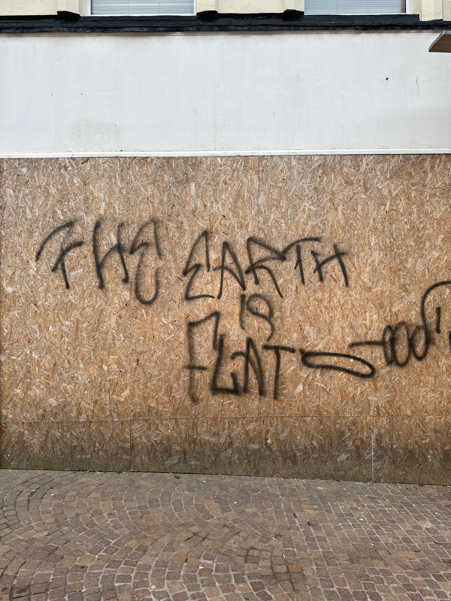 The image depicts a section of an urban environment. A light-colored building with windows occupies the left side of the frame. Adjacent to the building is a surface made of oriented strand board (OSB) covered in graffiti. The graffiti appears to be spray-painted in dark colors. To the right of the OSB surface is a paved area composed of small, reddish-brown paving stones laid in a curving pattern. The overall perspective suggests a view looking down at this arrangement. It is in the city of Folkestone and Hythe District, United Kingdom. | Open Wire