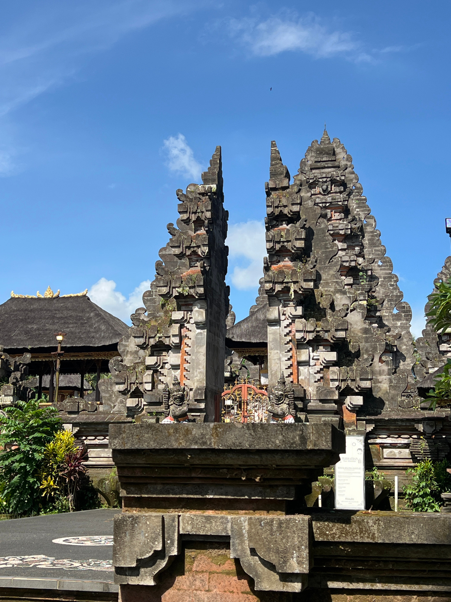 The image captures a view of traditional Balinese architecture in Petulu, Indonesia, featuring towering, ornately decorated stone structures against a blue sky with scattered clouds. The structures exhibit a stepped design with intricate carvings, and the color is in muted grey tones, suggesting the use of local stone. A glimpse of a thatched roof building can be seen beneath the main structures. In the foreground, a portion of a stone wall or gate is visible, with some foliage growing nearby. A small sign hangs on the wall. The scene appears to be a temple or a sacred site, reflecting the cultural and architectural heritage of Bali. | Open Wire