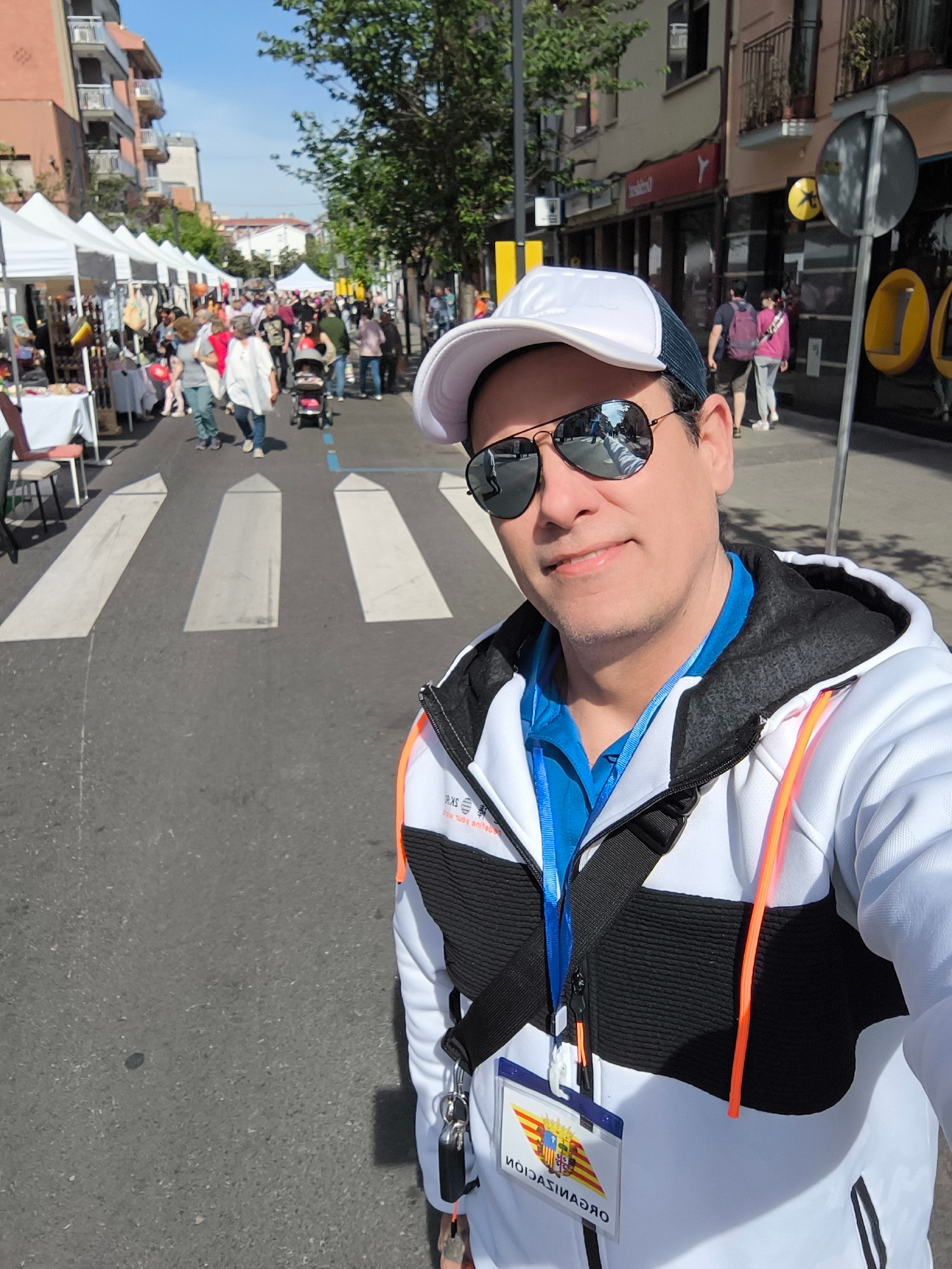 A man is depicted in a selfie, positioned in the foreground of a bustling outdoor street market in Ripollet, Spain. He wears a white and navy baseball cap, aviator sunglasses that reflect the street a…read more