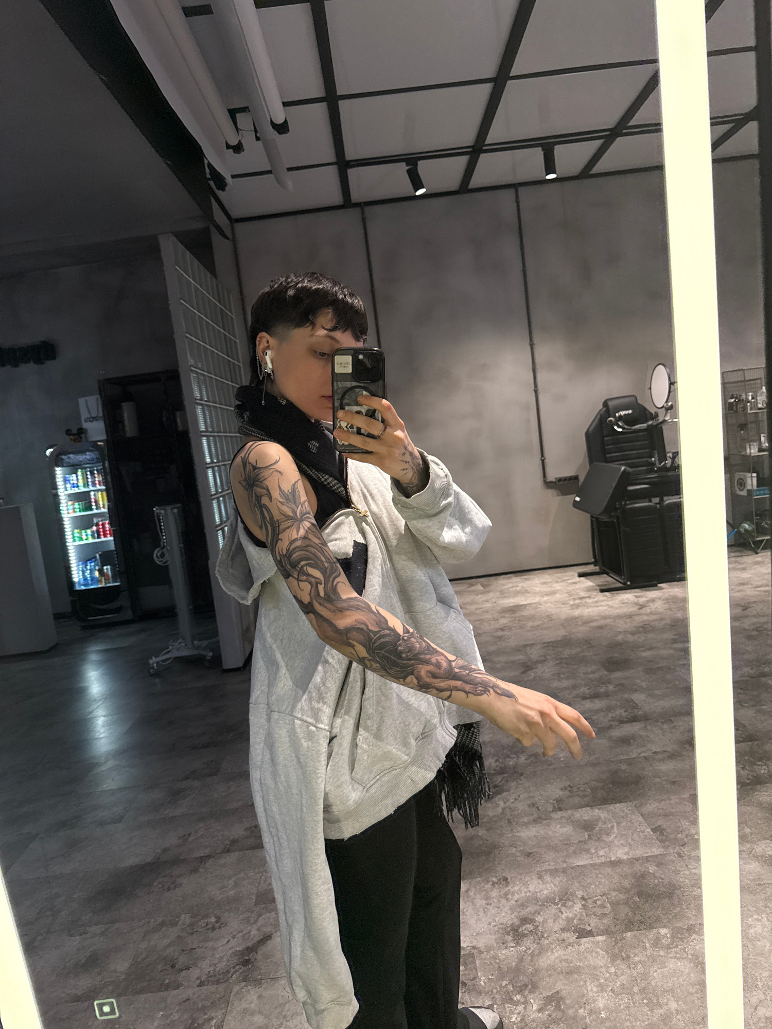A person stands in front of a mirror, likely inside a business, judging by the barber's chair and cooler visible in the reflection. The individual, with short dark hair, wears a light grey hooded swea…read more