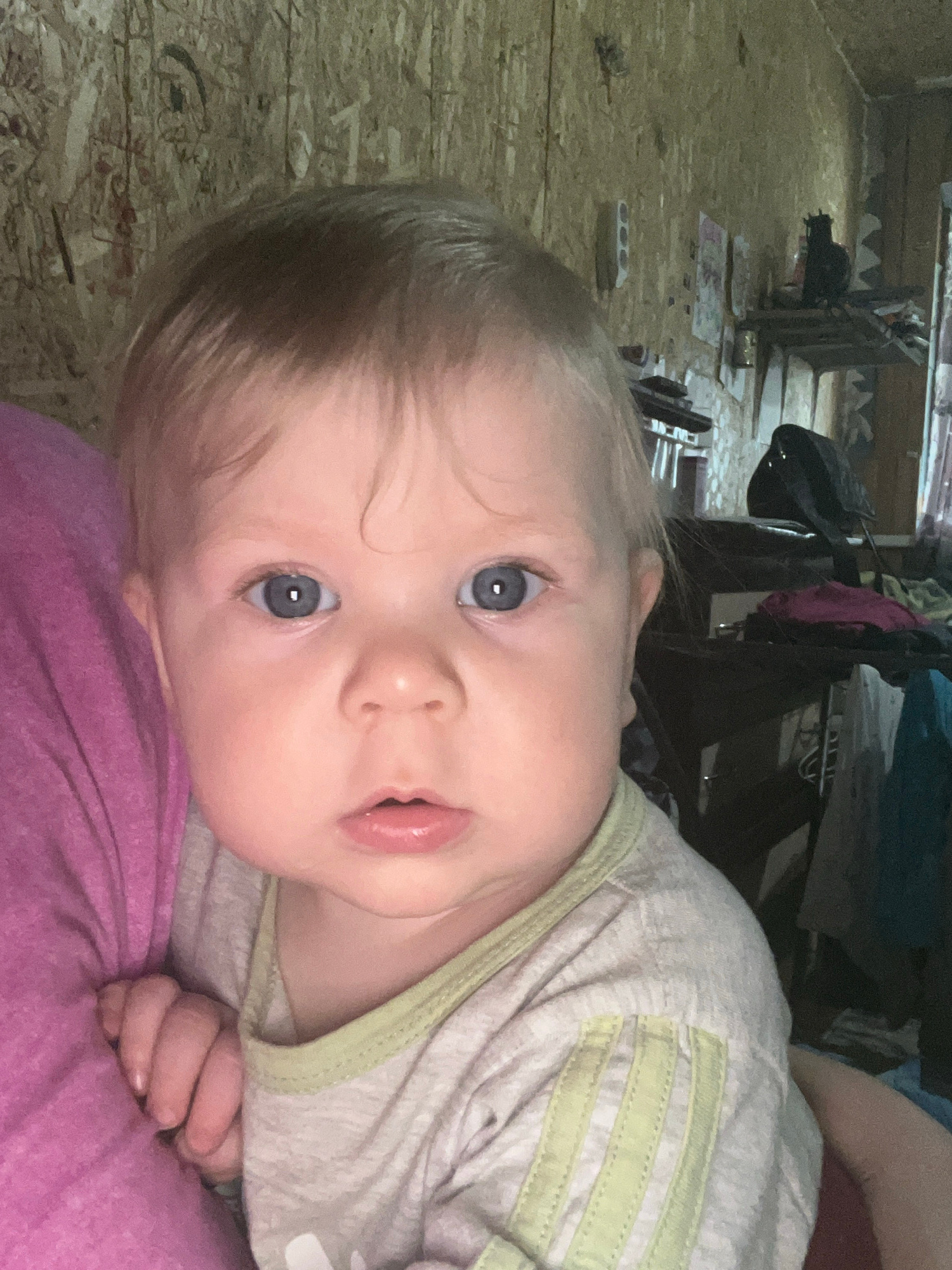 A close-up shot shows a baby with fair skin, light hair, and blue eyes. The baby is lying down on a pink surface and is wearing a light gray shirt with light green trim and stripes on the shoulder. Th…read more