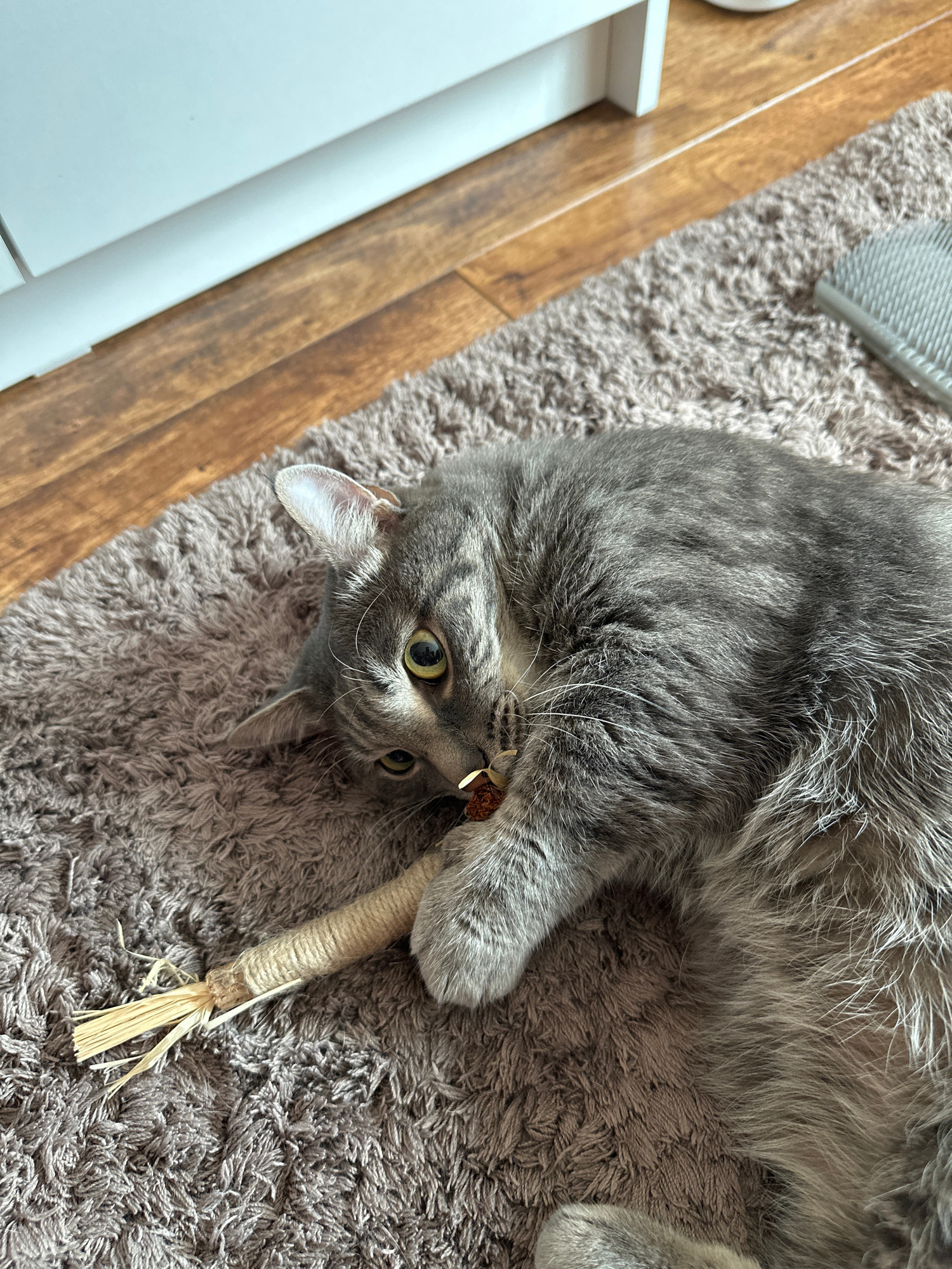 A gray tabby cat lies on a gray shag carpet, playing with a cat toy made of string and straw. A grooming brush is nearby on the carpet. A white and brown wooden structure is partially visible to the l…read more