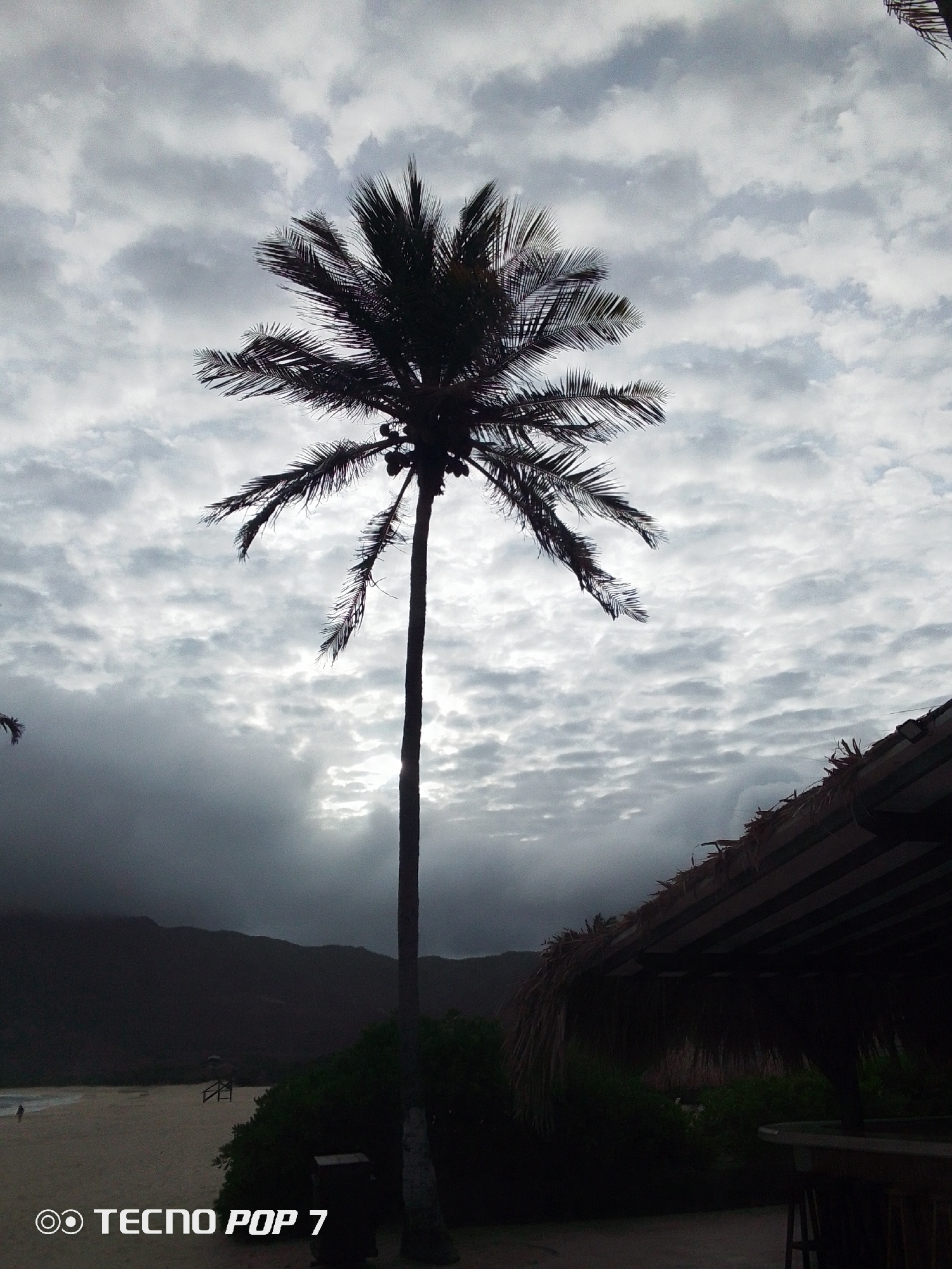 The image depicts a coastal scene in Pedro González, Venezuela, under an overcast sky filled with dense grey and white altocumulus clouds. A tall, slender palm tree, heavily silhouetted, dominates the…read more