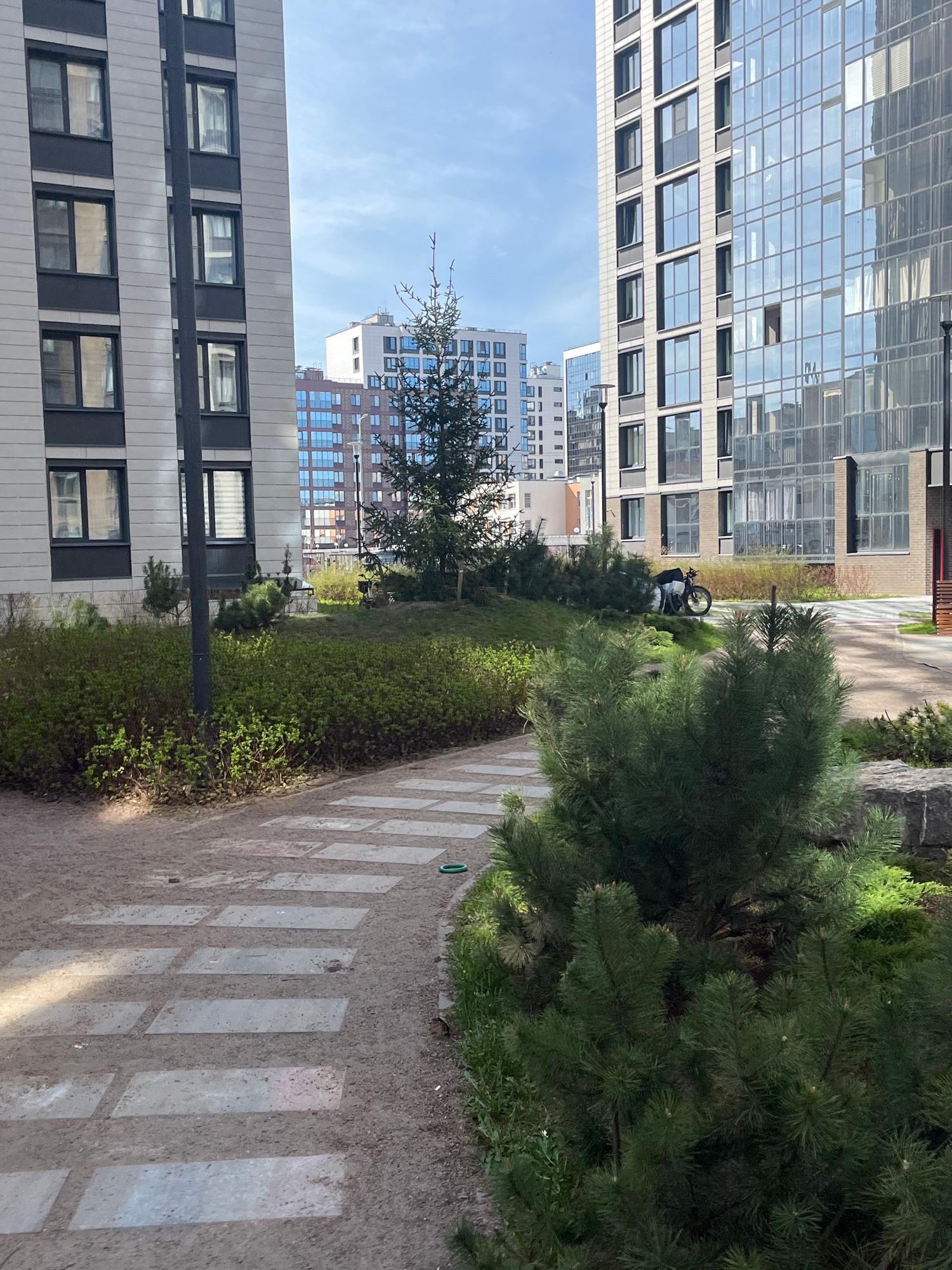 This image captures a modern urban landscape, likely within a residential or business complex in Saint Petersburg, Russia. The scene is dominated by contemporary architecture and carefully maintained…read more