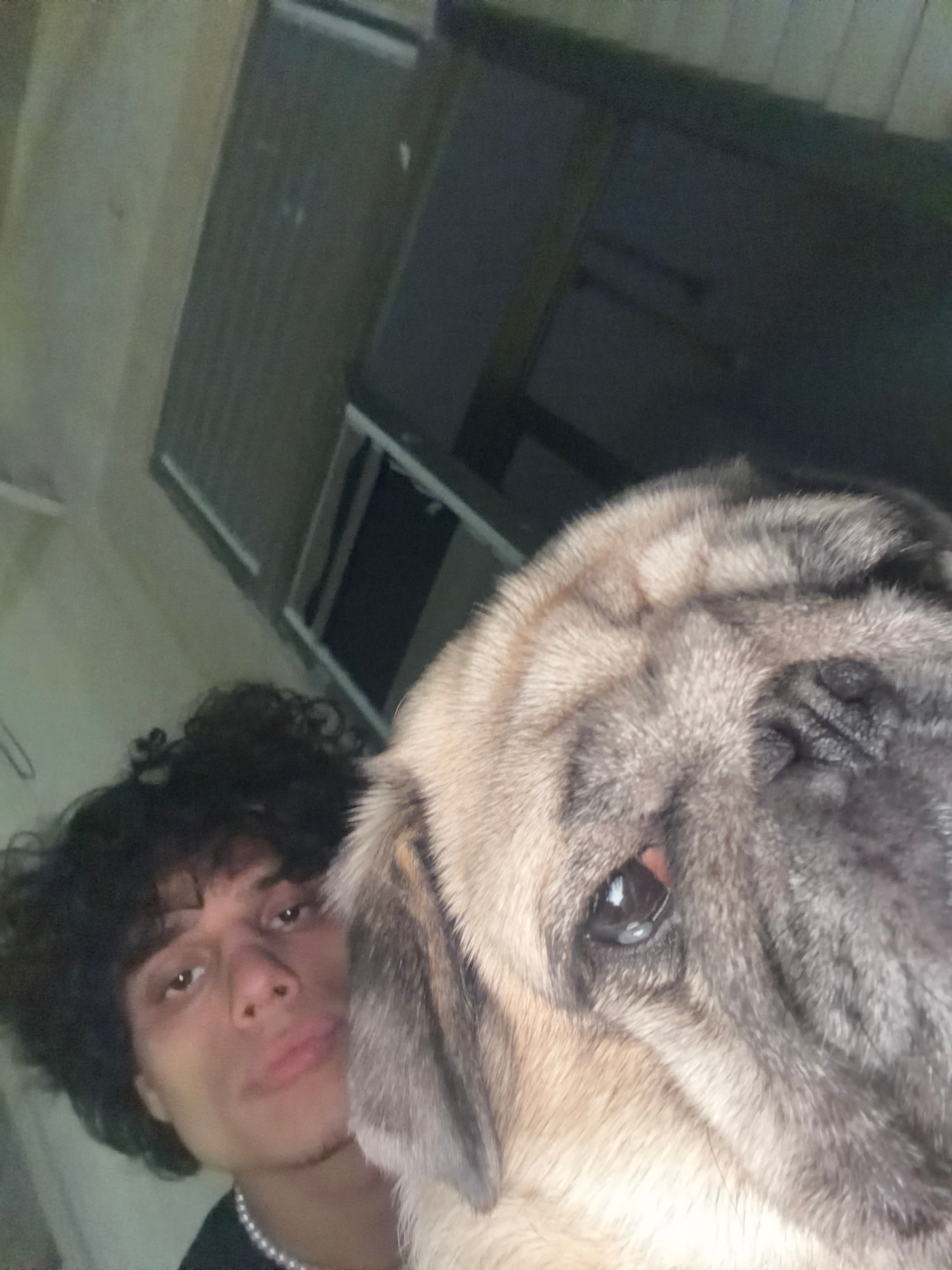 A selfie taken from a low angle features a light brown pug dog's face occupying the upper portion of the frame. Below and slightly behind the dog is a person with dark, curly hair, brown eyes, and a f…read more