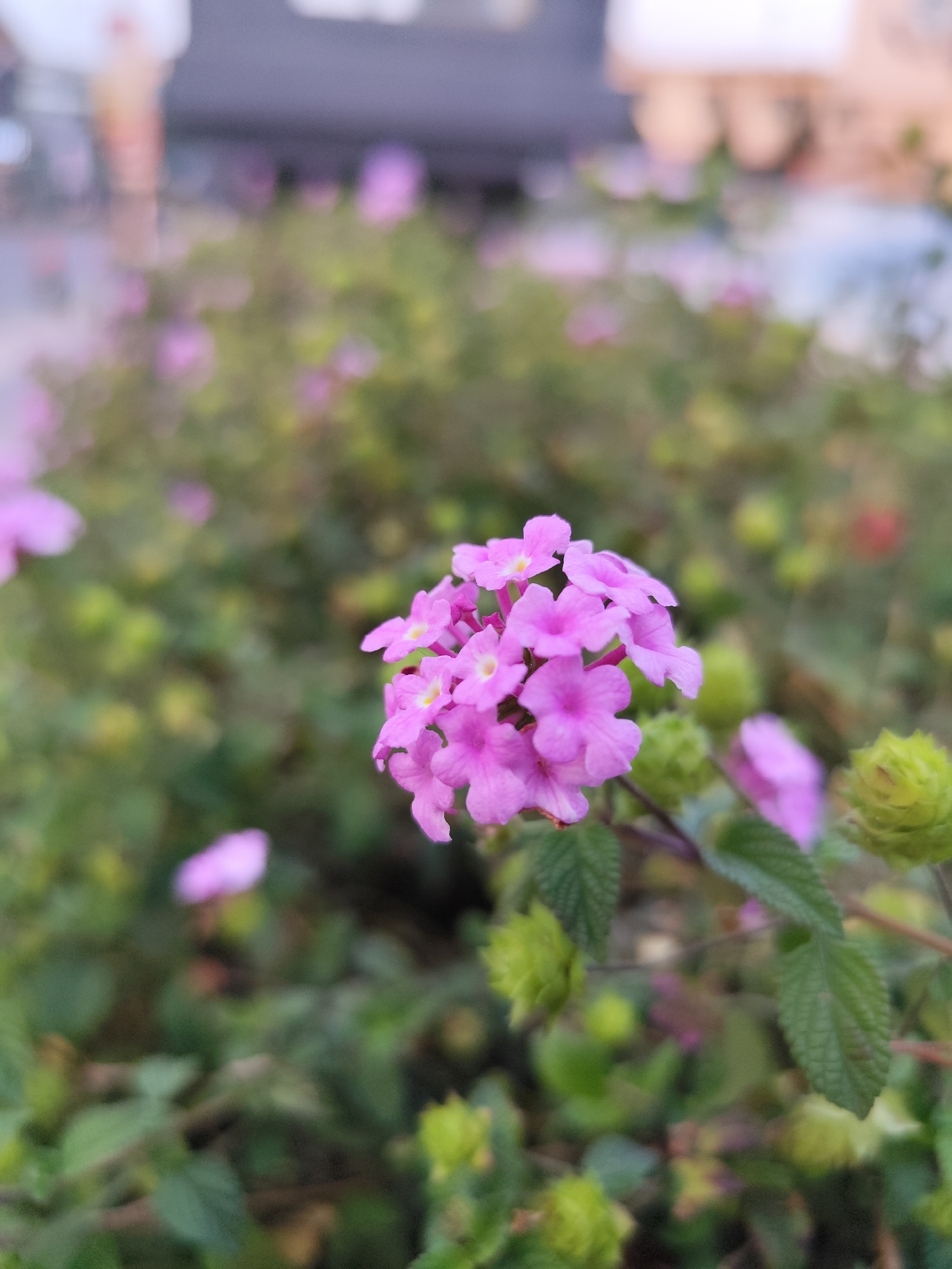 Close-up shot of a pink Lantana flower cluster in a garden setting. The flowers are small, four-petaled, and arranged in a dense head. Behind the main flower cluster, there is a blurred background of…read more