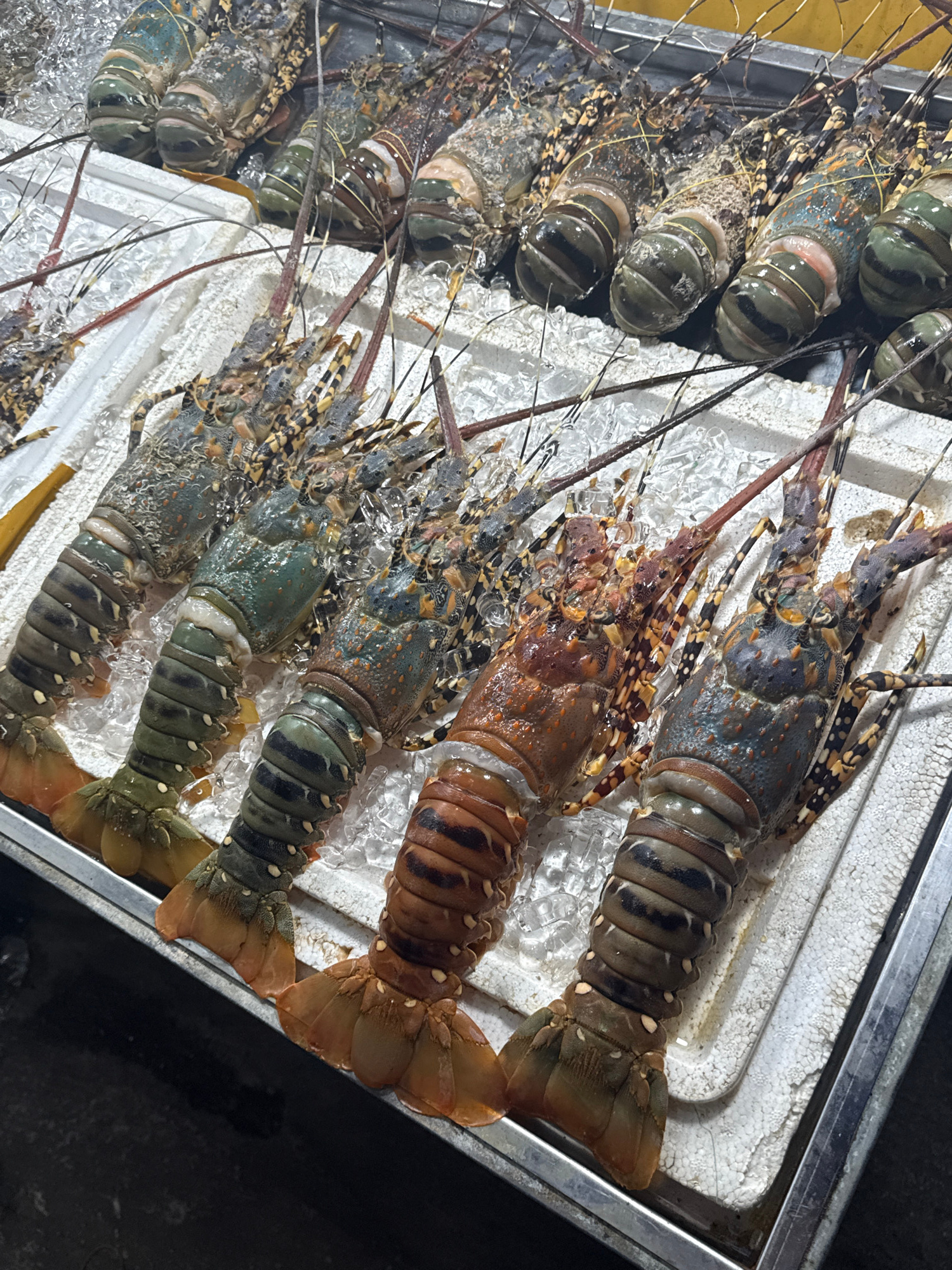 The image shows a metal tray filled with ice and several spiny lobsters, likely for sale. The lobsters are arranged in rows, displaying a variety of colors from greenish-gray to brownish-orange. They…read more