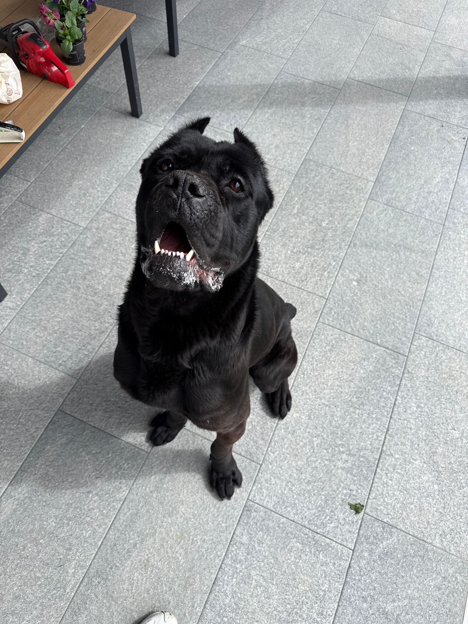 A large, black dog, likely a Cane Corso with cropped ears, is captured lying or crouching on a light gray tiled outdoor patio. The dog looks directly upwards at the camera with its mouth open, reveali…read more