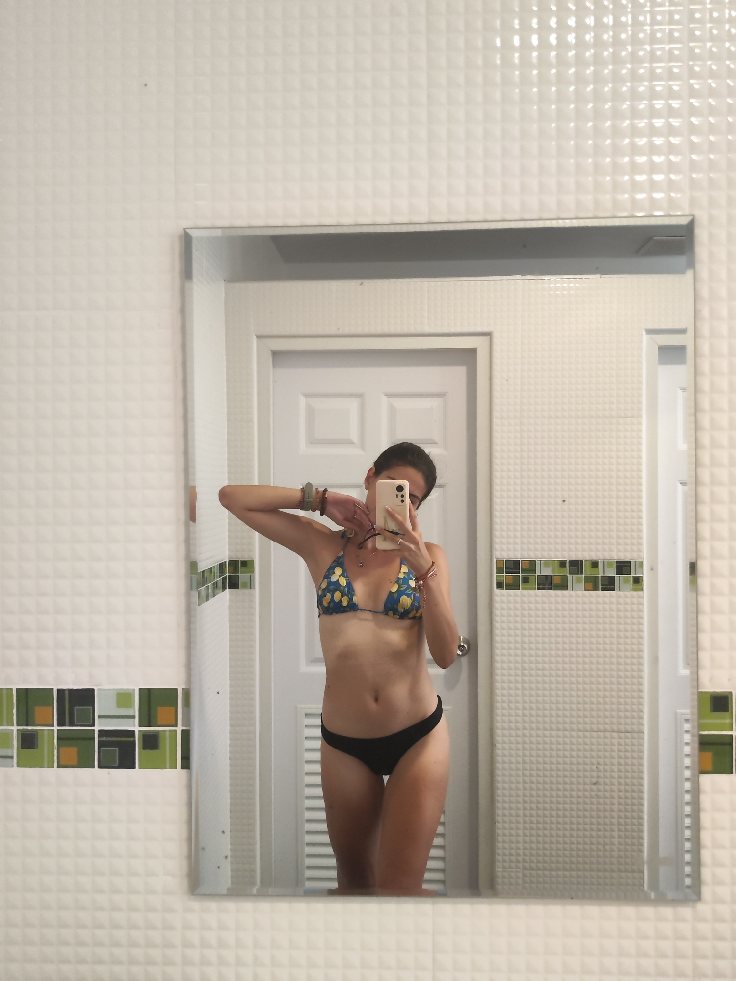A woman stands in front of a bathroom mirror taking a selfie with her phone. She is wearing a blue bikini top with yellow and green lemon patterns, and black bikini bottoms. Her hair is tied back. She…read more