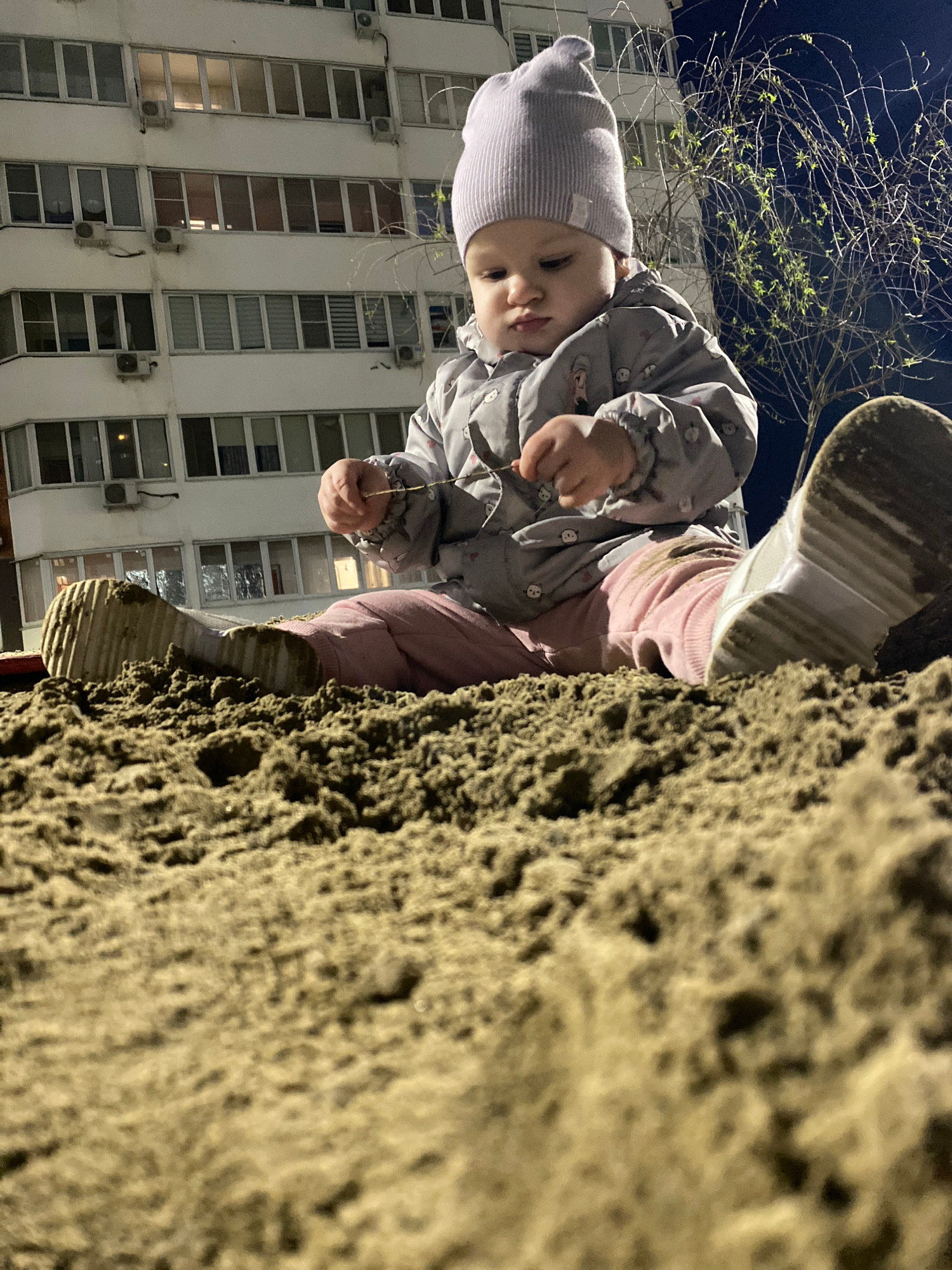 A low-angle shot depicts a child wearing a light gray beanie, a gray puffer jacket with patterns, and pink pants standing next to a large, textured tree trunk. The soles of the child's shoes are visib…read more