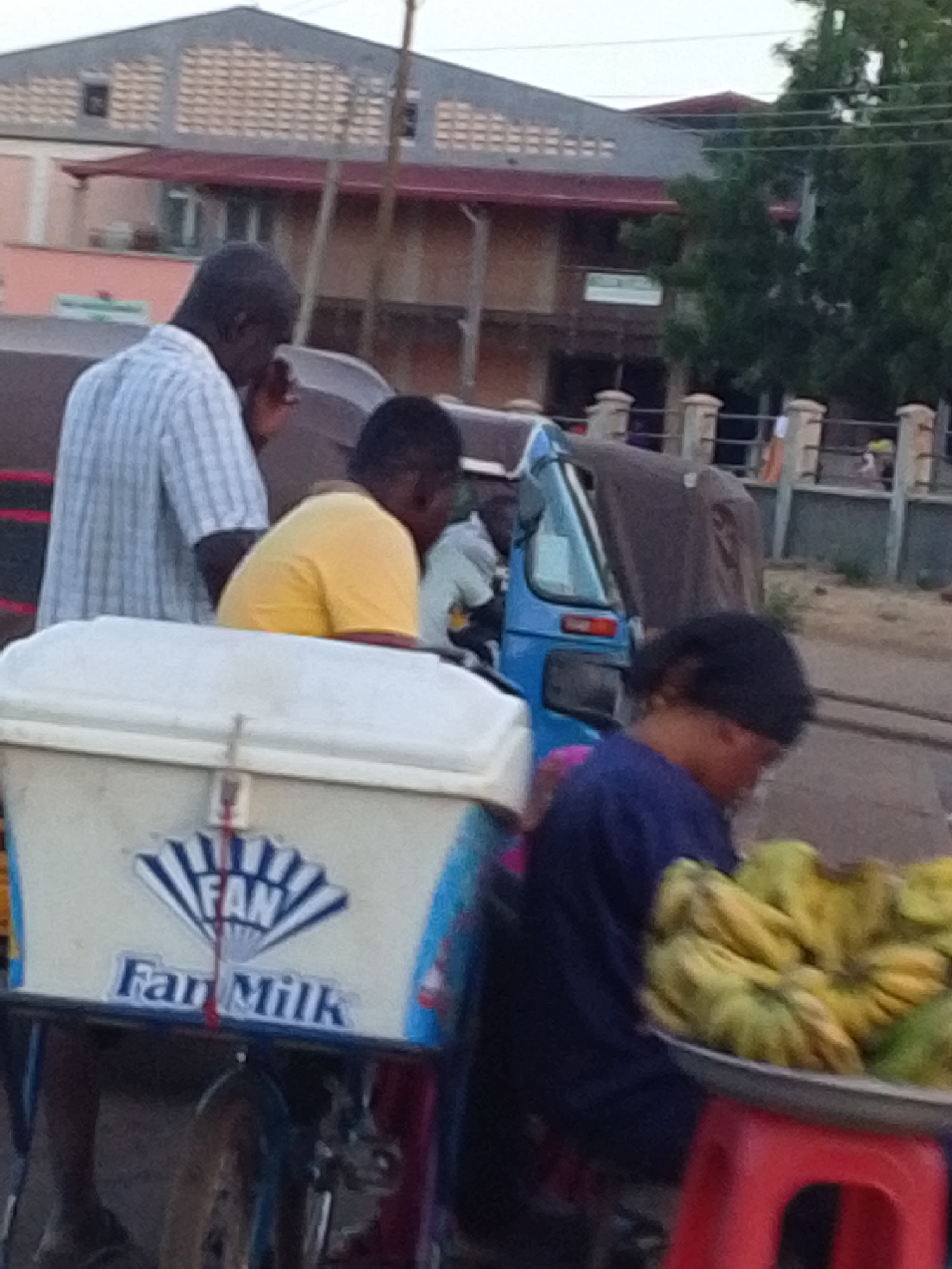 A daytime street scene in Tamale, Ghana shows several people near a blue motorized tricycle. A man in a vertically striped shirt is at the left. In front of the tricycle is a white cooler that display…read more