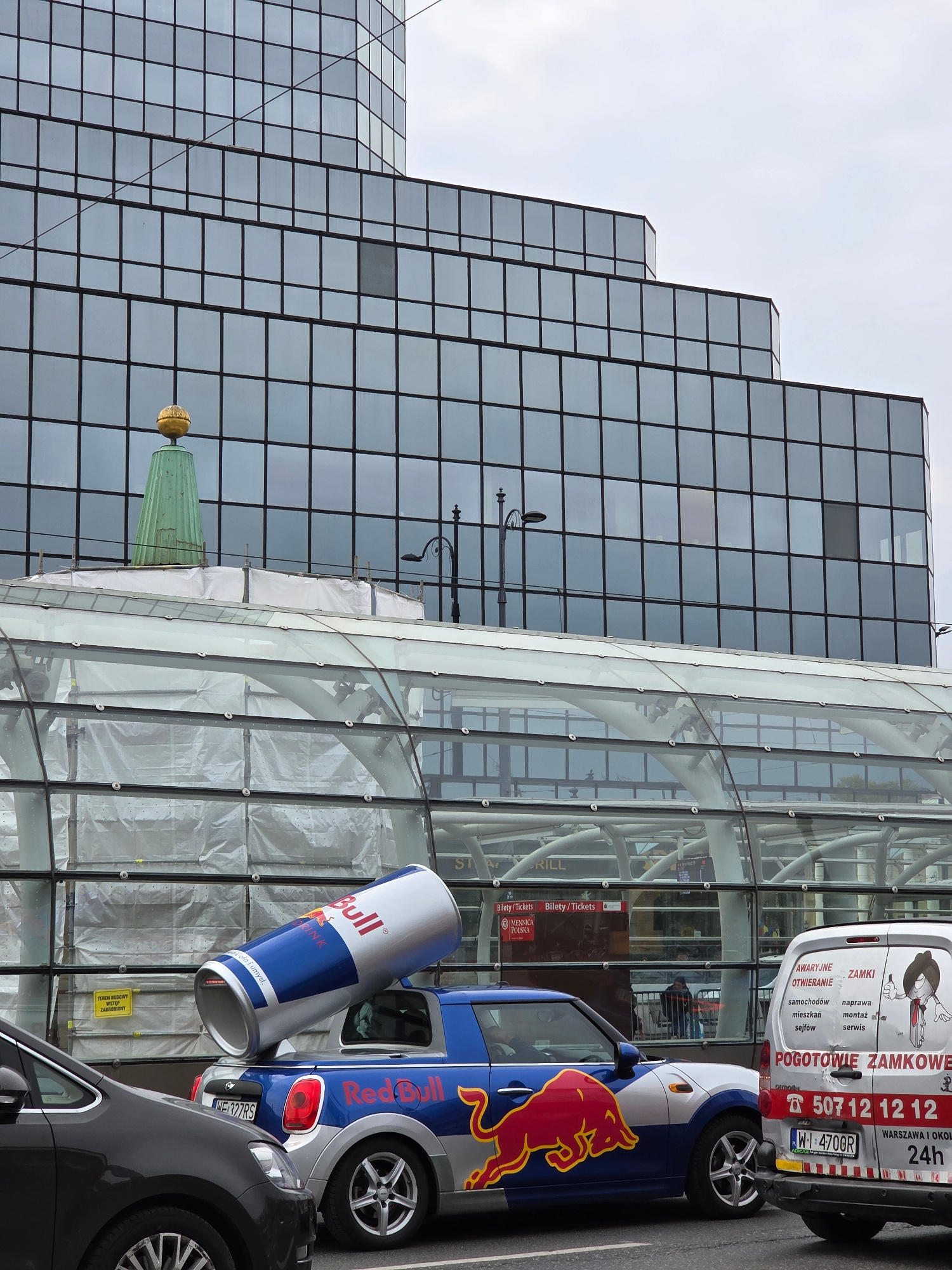The image shows a street scene in Warsaw, Poland, featuring several vehicles parked in front of a modern building with extensive glass facade. * **Building:** A tall, modern building with a stepped…read more