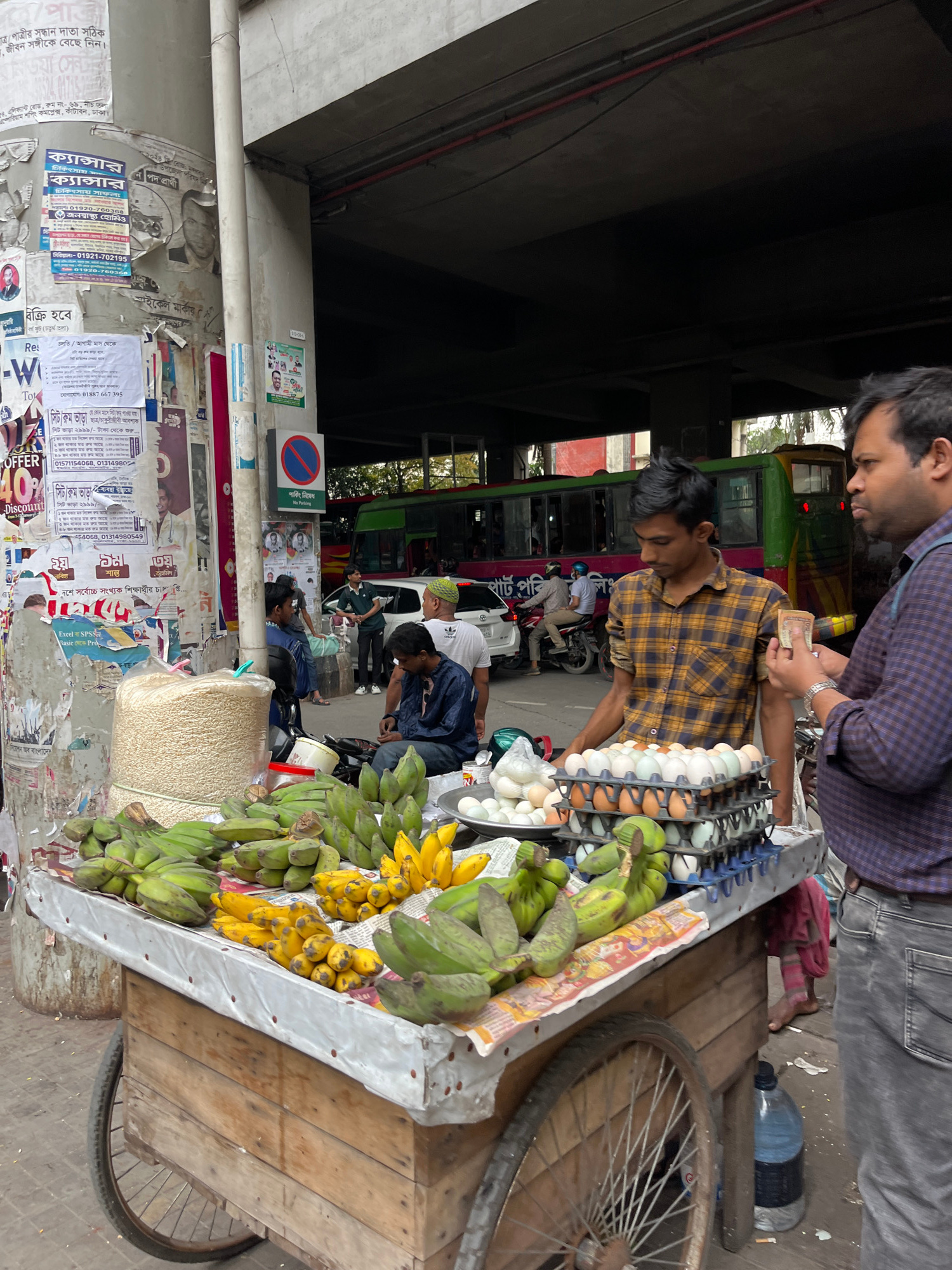 Here is a description of the image: The image depicts a street scene in Dhaka, Bangladesh. A vendor is selling bananas and eggs from a wooden cart. The cart has a rusty wheel and is loaded with green…read more