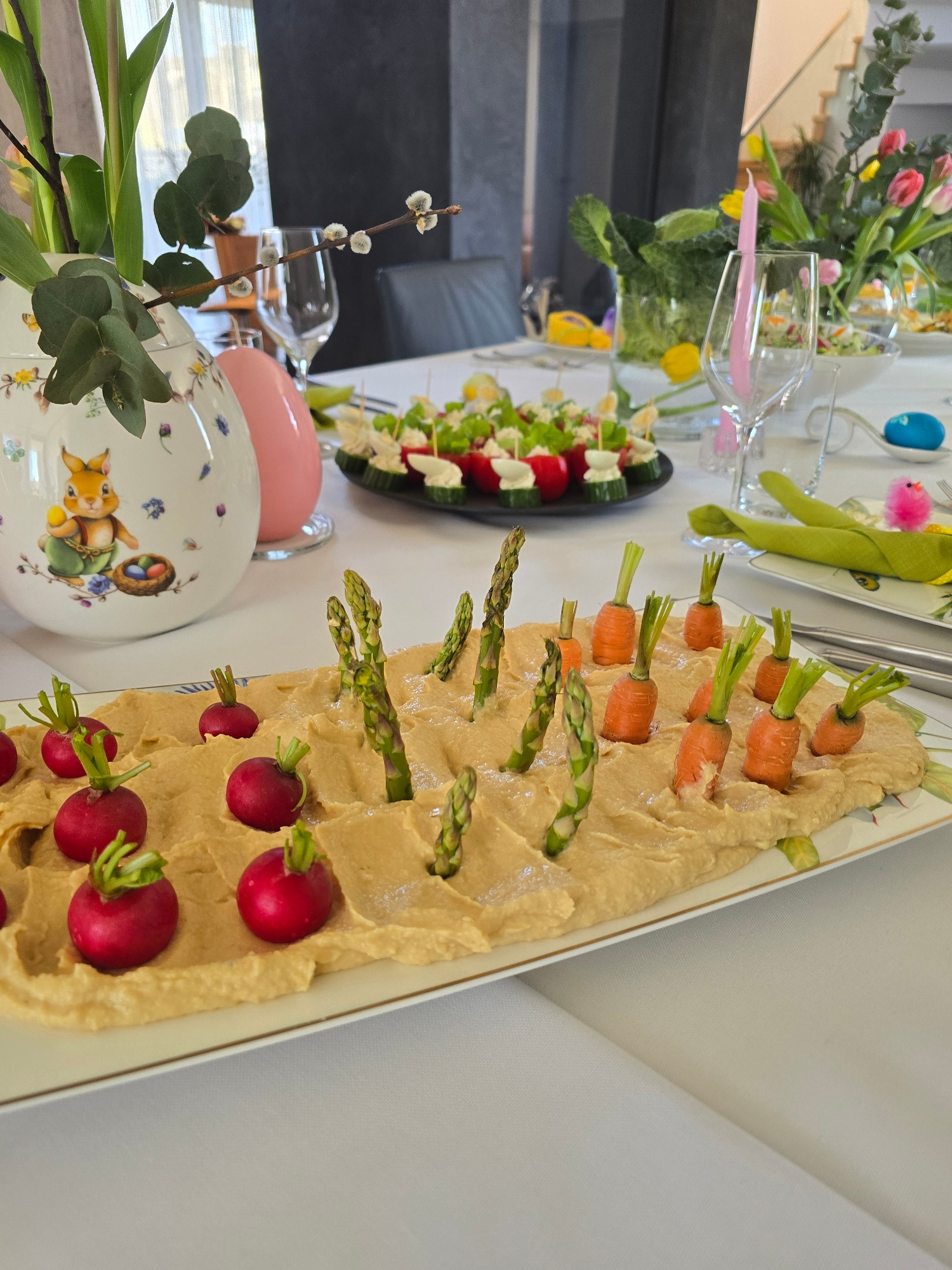The image shows a dining table set for a meal, likely indoors. The table is covered with a white tablecloth. There is a platter of hummus with radishes, asparagus, and baby carrots sticking out of it…read more