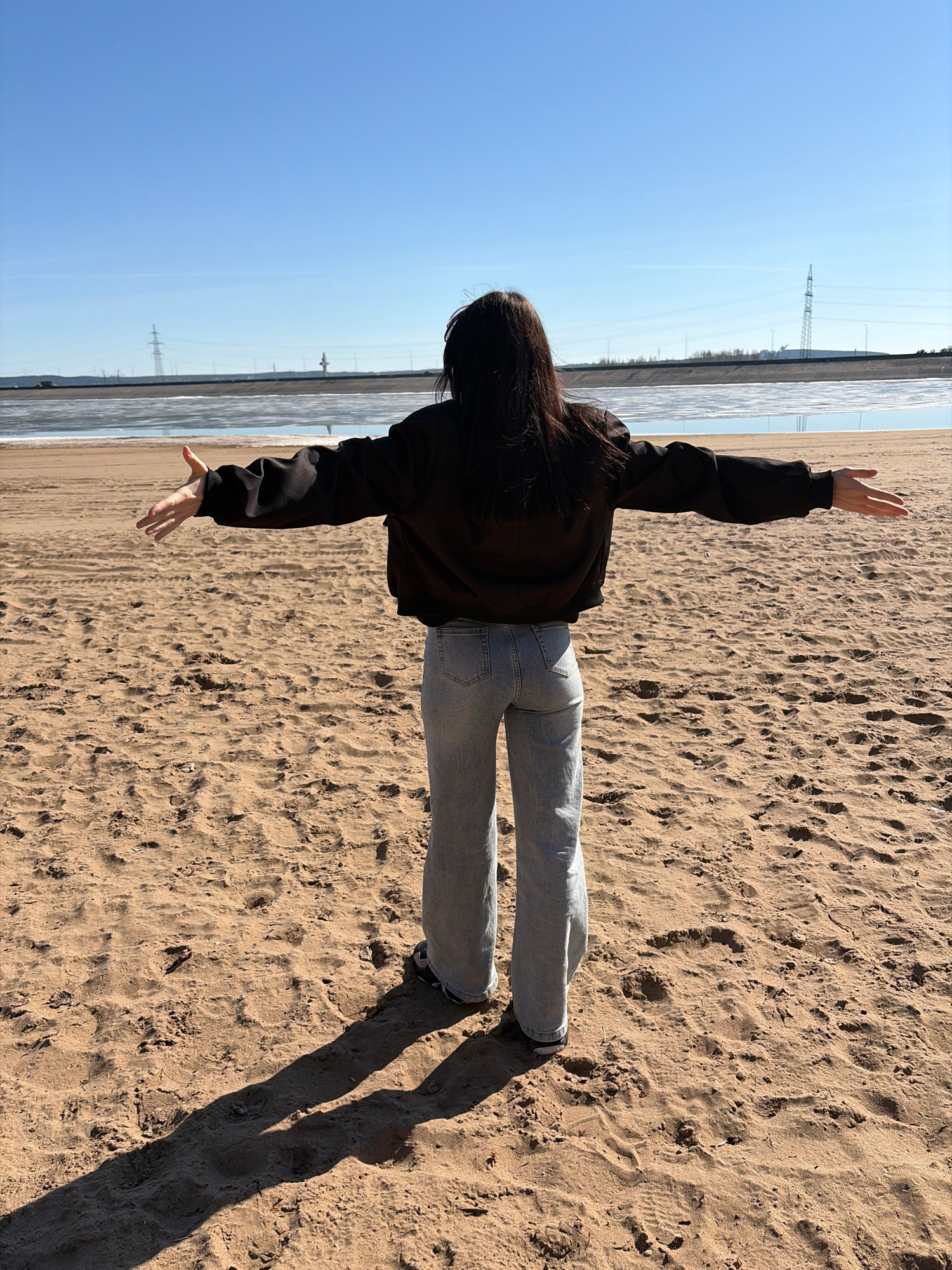 A full-length, vertically oriented photograph captures a person standing on a sandy shore with their back to the viewer, arms outstretched horizontally. The individual has long, dark hair and is weariβ¦read more