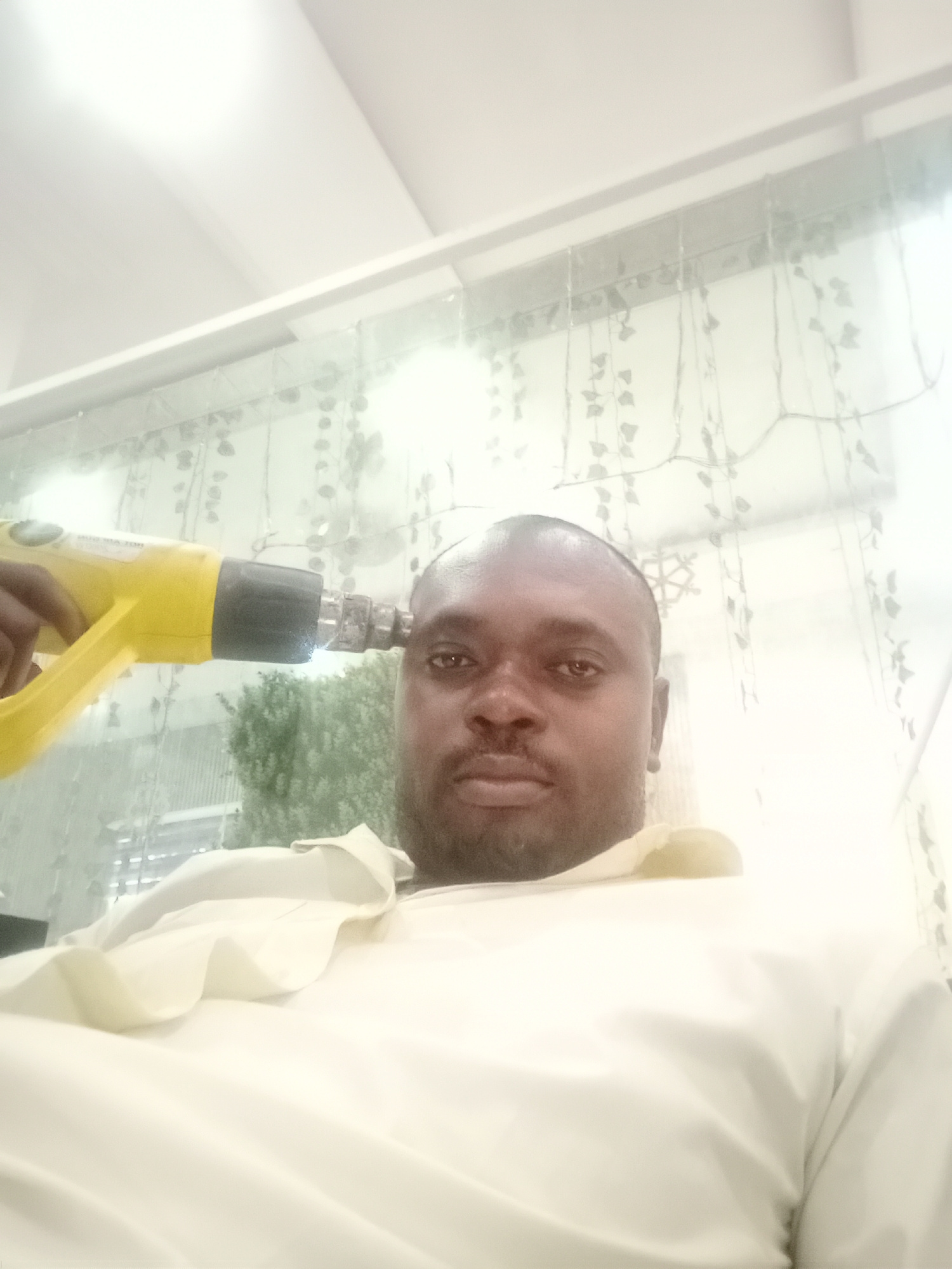 The image depicts a dark-skinned man with a beard, facing forward, with a yellow heat gun pointed at his head. He is wearing a light-colored garment. The background features a curtain or partition wit…read more