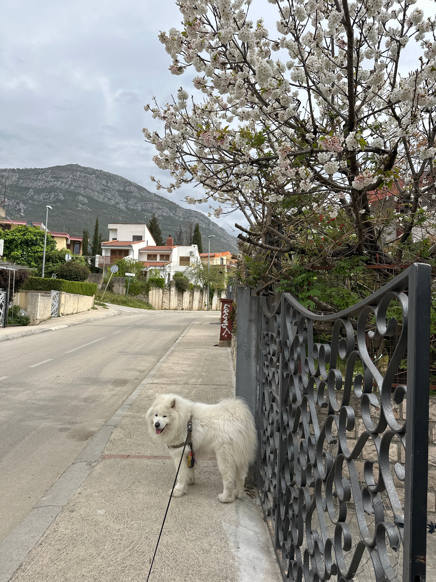 A medium, eye-level, slightly tilted, outdoor shot depicts a white Samoyed dog on a leash standing on a paved sidewalk next to a dark metal gate with a decorative, scroll-like design in Šušanj, Monten…read more