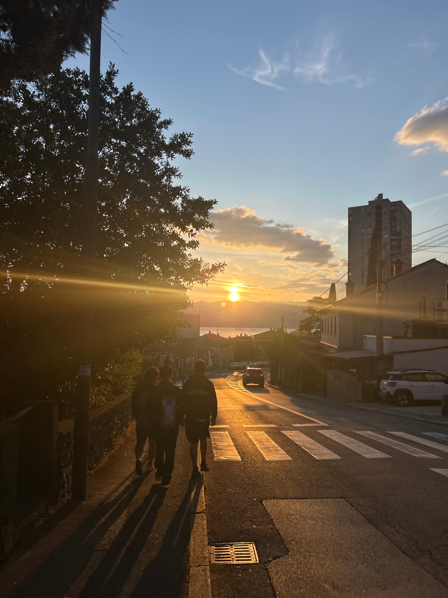 The image depicts a street scene in Grad Rijeka, Croatia, at sunset. The sun is setting over the Adriatic Sea, visible in the background between buildings. The foreground includes a tree and a street…read more