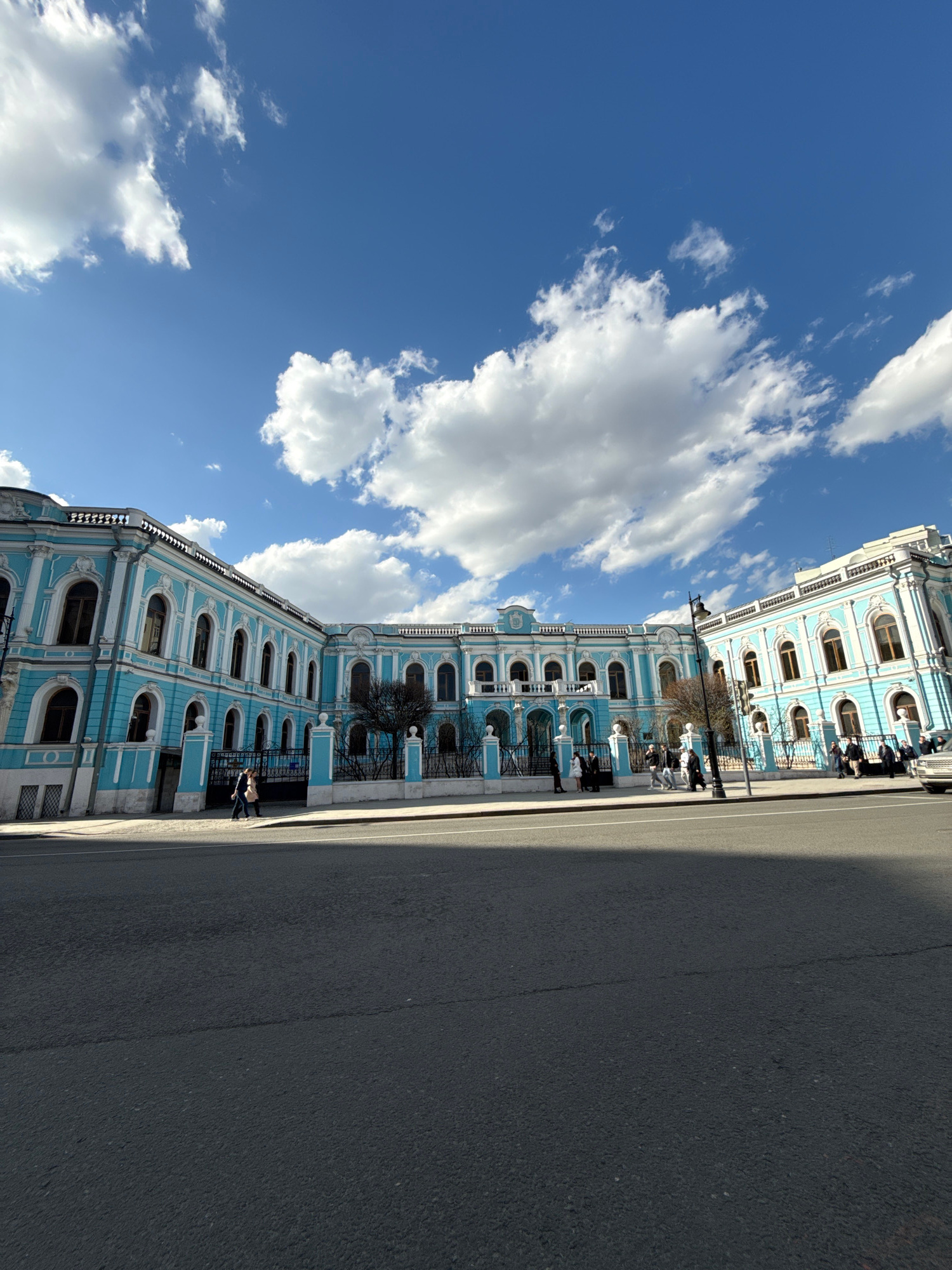 The image shows a building in Moscow, Russia, specifically the Smolny Institute. The building has a light blue facade with white trim and is set against a bright blue sky with fluffy white clouds. A p…read more