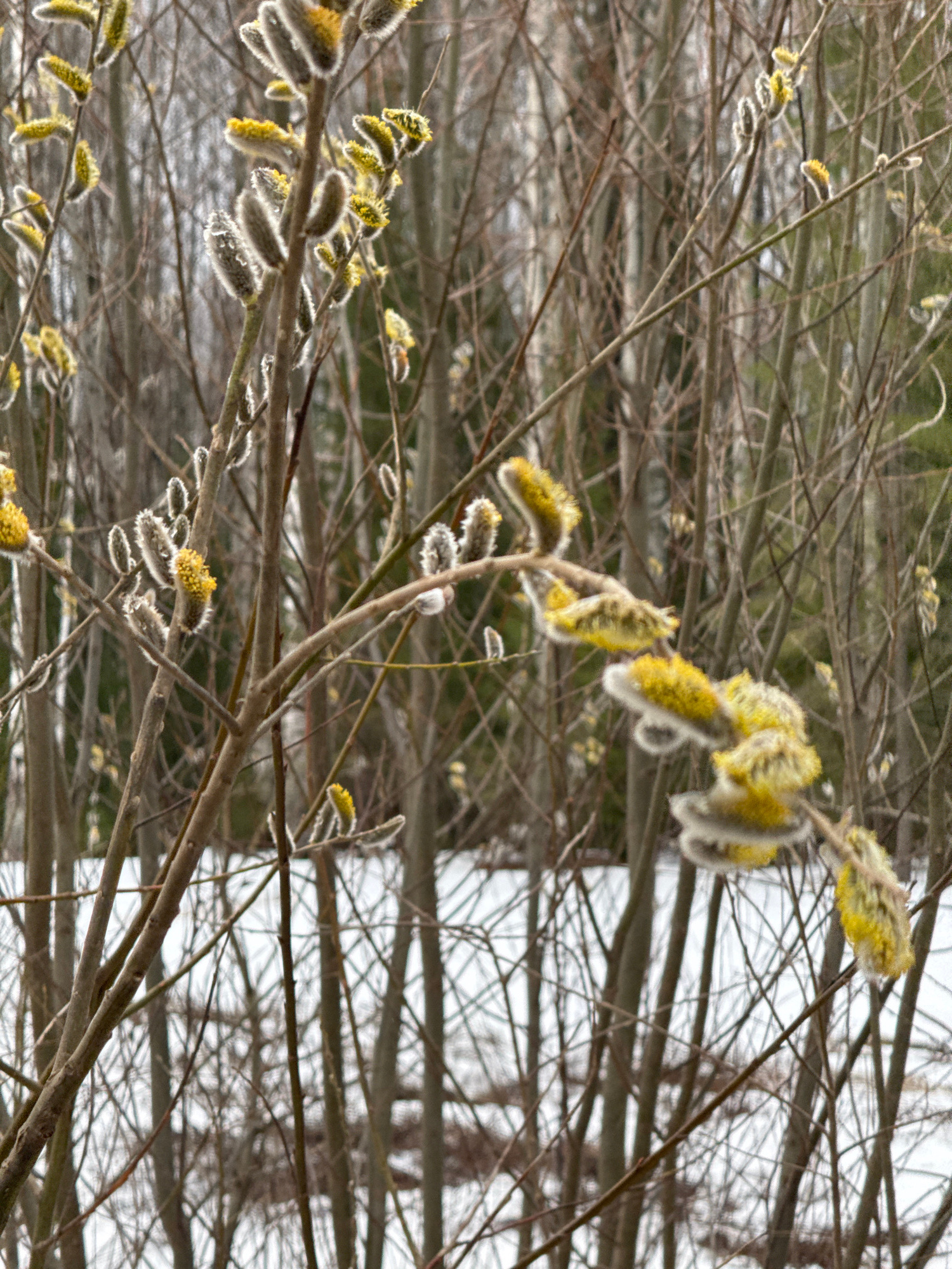 The image depicts a close-up of budding branches, specifically pussy willows, with their characteristic furry catkins showing a hint of yellow. The branches are intertwined against a blurred backgroun…read more