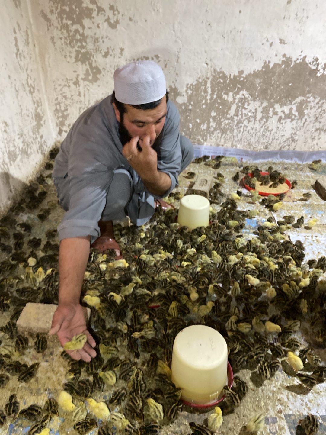 A man wearing a light-colored kufi cap and a gray tunic squats in a room filled with numerous quail chicks. He holds one chick in his left hand and touches his face with his right. The walls of the ro…read more