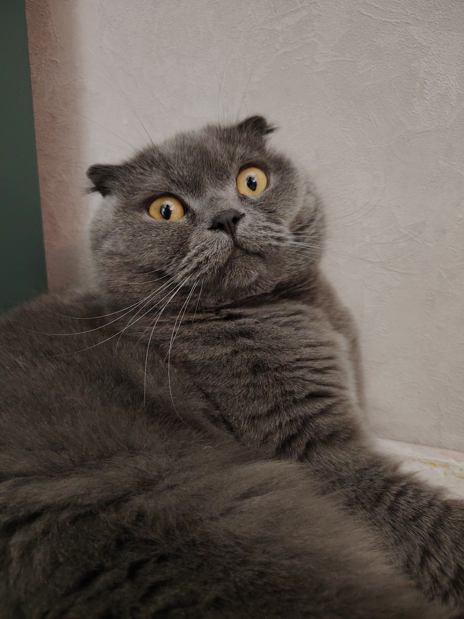 A domestic cat, identified as a gray Scottish Fold due to its distinctive folded ears and dense fur, is captured in a close-up indoors in Markovskii, Russia. The cat is lying down, likely on its back…read more