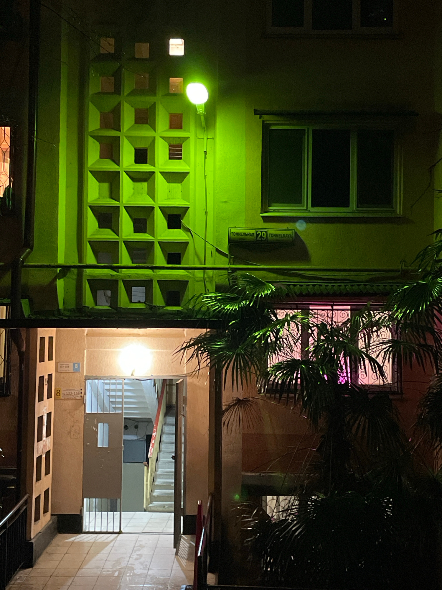 The image depicts an exterior urban scene at night, likely in Sochi, Russia, based on the Cyrillic characters on a building sign that says "ТОННЕЛЬНАЯ 29" which translates to "TONNELNAYA 29". The buil…read more