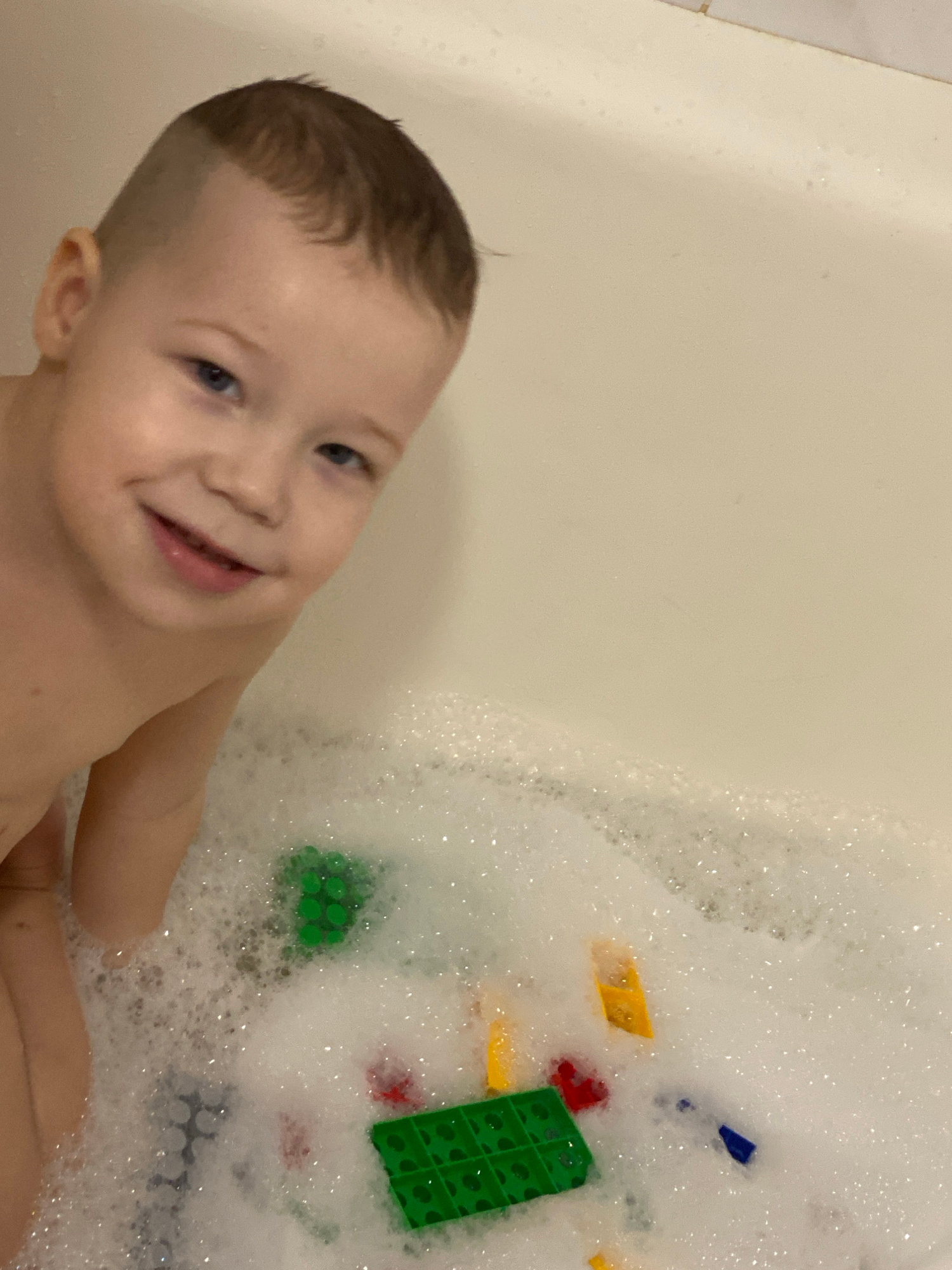 A young child is in a bathtub filled with bubbles. Colorful building blocks, including green, yellow, red, and blue, are visible amidst the bubbles. The child has fair skin, short brown hair, and blue…read more