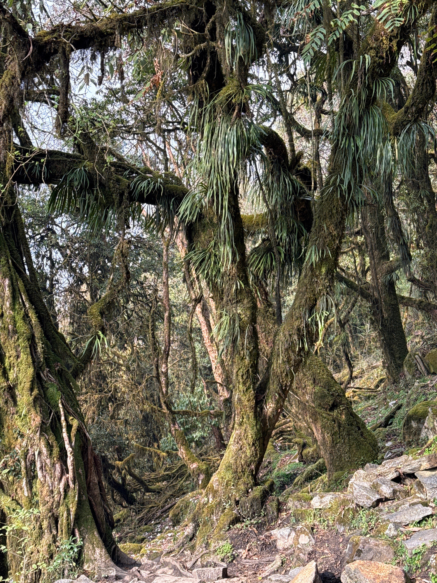 This image depicts a dense and verdant forest scene, characteristic of a humid, possibly mountainous, region such as Lumre, Nepal. The primary subjects are numerous ancient trees, whose gnarled trunks…read more