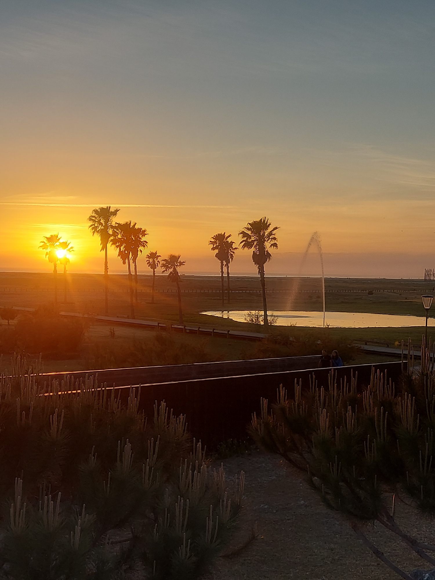 The image depicts a sunset in Figueira da Foz, Portugal. A row of palm trees stands silhouetted against the bright orange and yellow horizon. A fountain sprays water into the air in the background. Th…read more