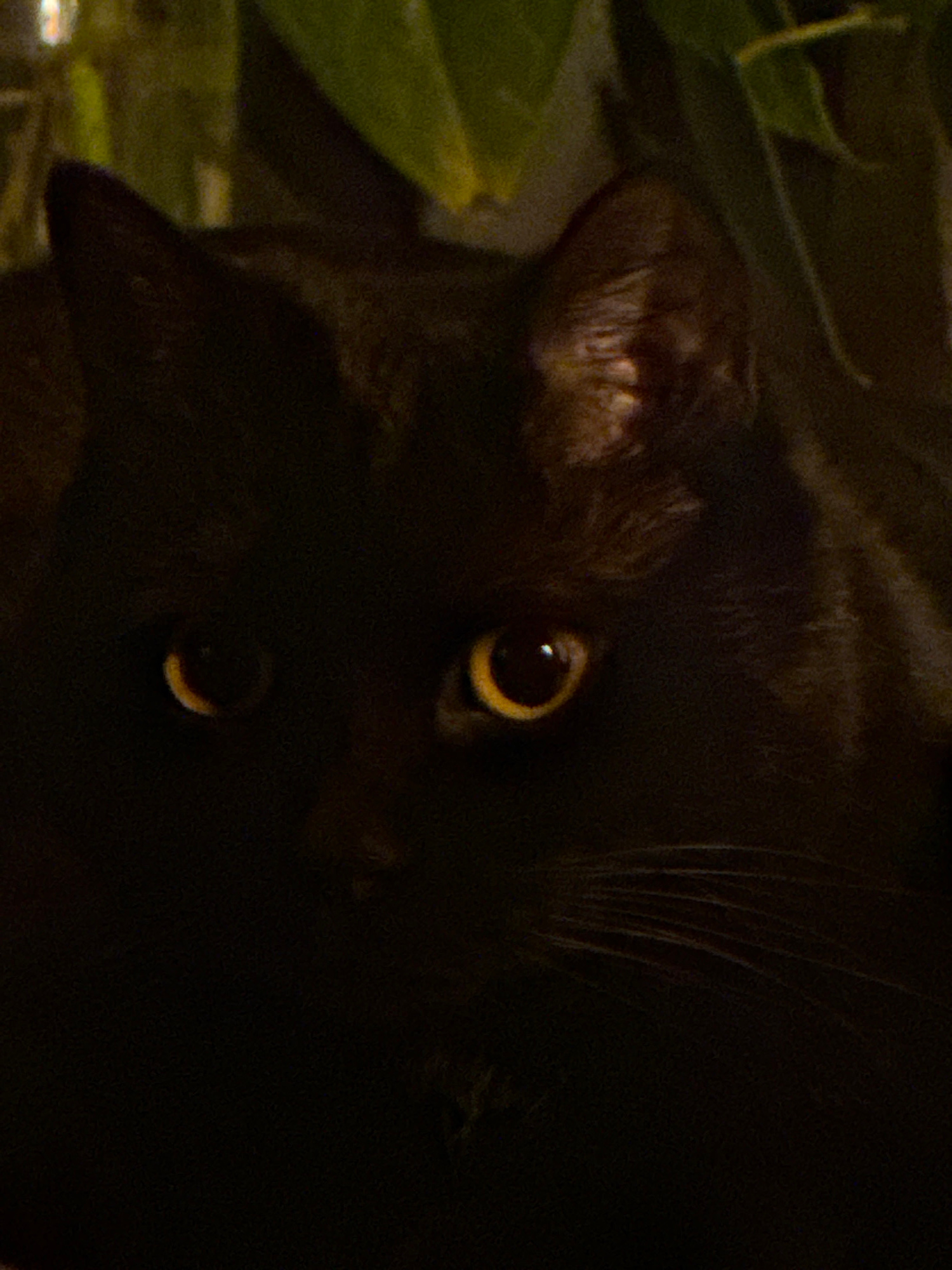 A dark, blurred image features a black cat. The cat is partially obscured in shadow, but its eyes are visible and reflect a golden color. Part of the cat's ear is visible to the left. The cat is parti…read more
