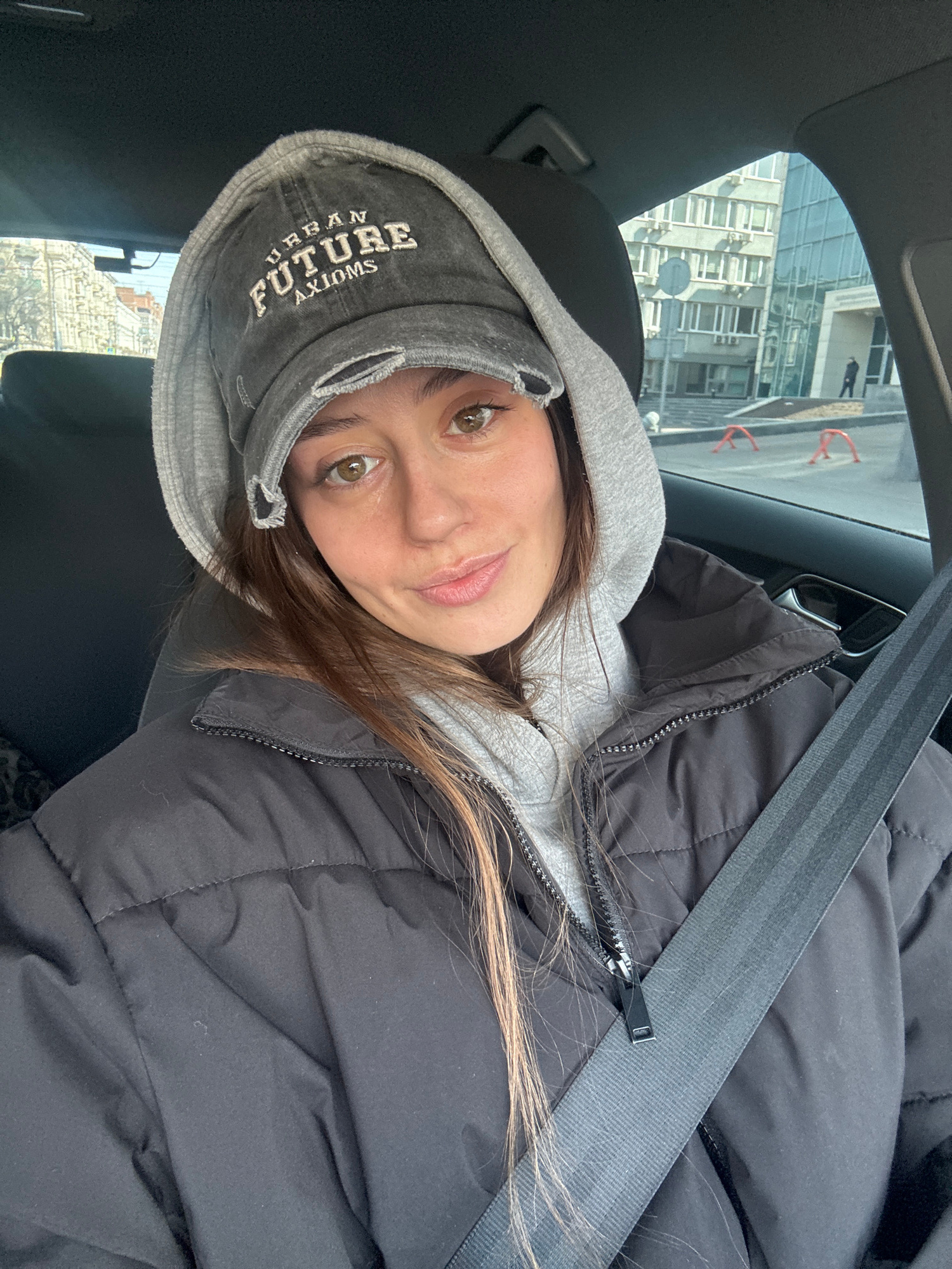 A young woman is captured in a casual, selfie-style photograph taken inside a car, likely from the passenger seat, with an urban background visible through the window. She looks directly at the camera…read more