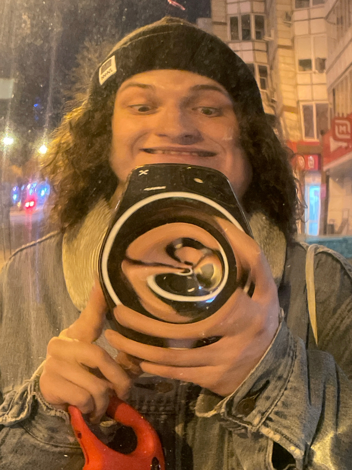 A person with curly hair and wearing a black beanie and denim jacket is taking a selfie in a distorted mirror, capturing their face and the reflection of the surrounding cityscape at night. The locati…read more