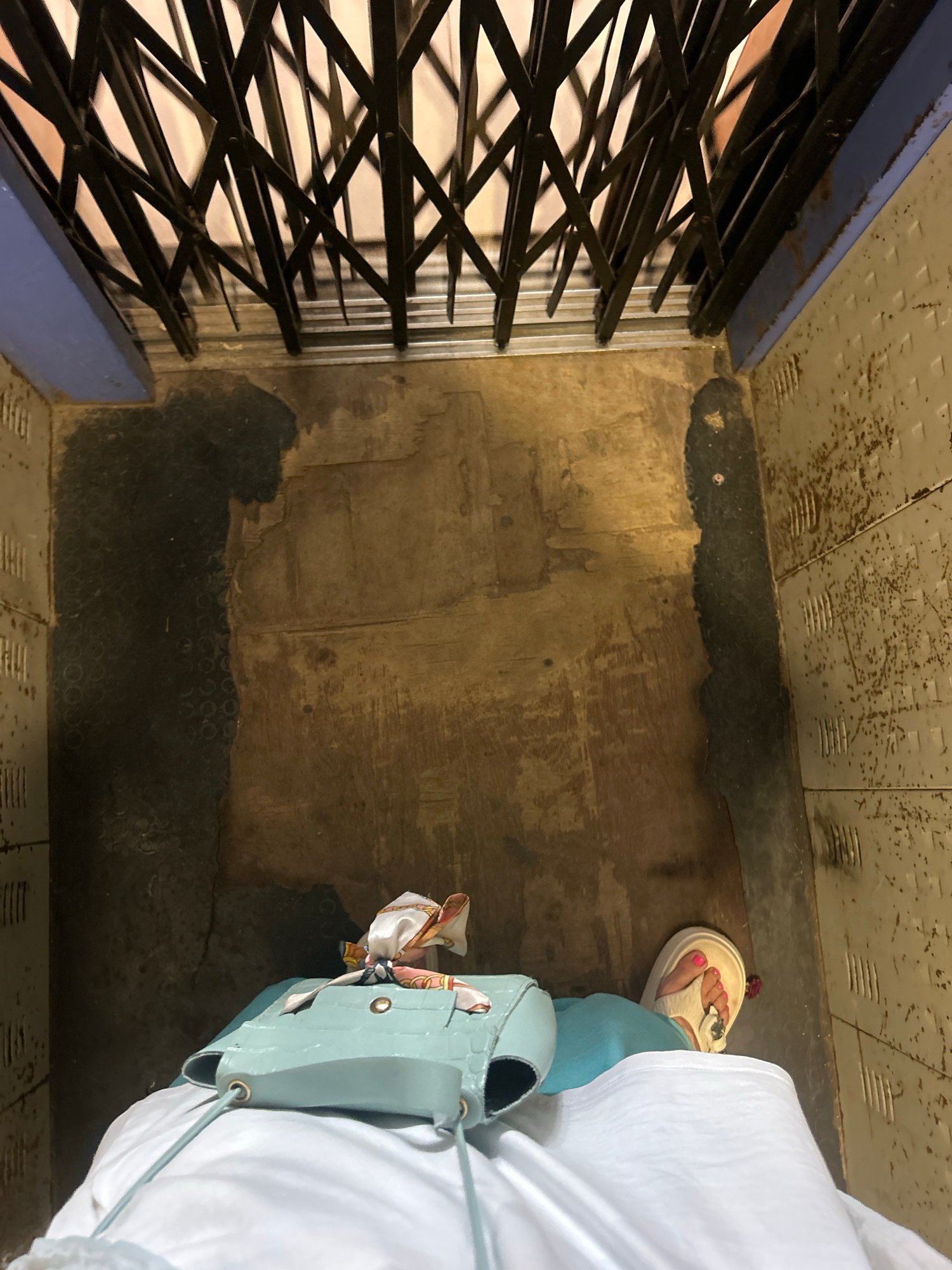 The image depicts an individual standing inside an elevator, located in Puttaparthi, India. The elevator is old and worn, with a security gate on the left. The floor and walls appear dirty, showing si…read more