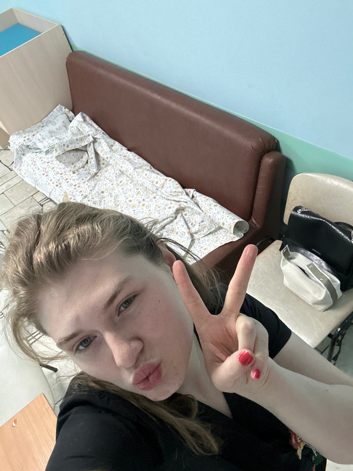A woman with light hair and blue eyes takes a selfie, pouting her lips and holding up a peace sign. She wears a black top. Behind her is a light blue wall, a brown padded bench, and a white dress with…read more