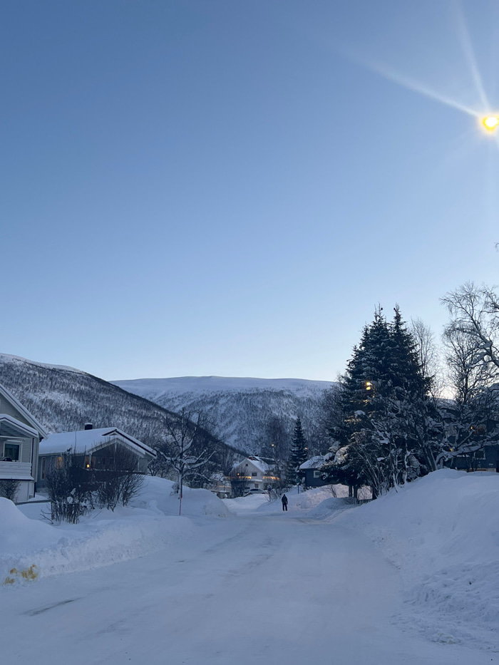 The image displays a snow-covered residential street in Tromsø, Norway, under a clear, light blue sky. Snow blankets the ground, rooftops, and tree branches. In the background, prominent snow-covered…read more
