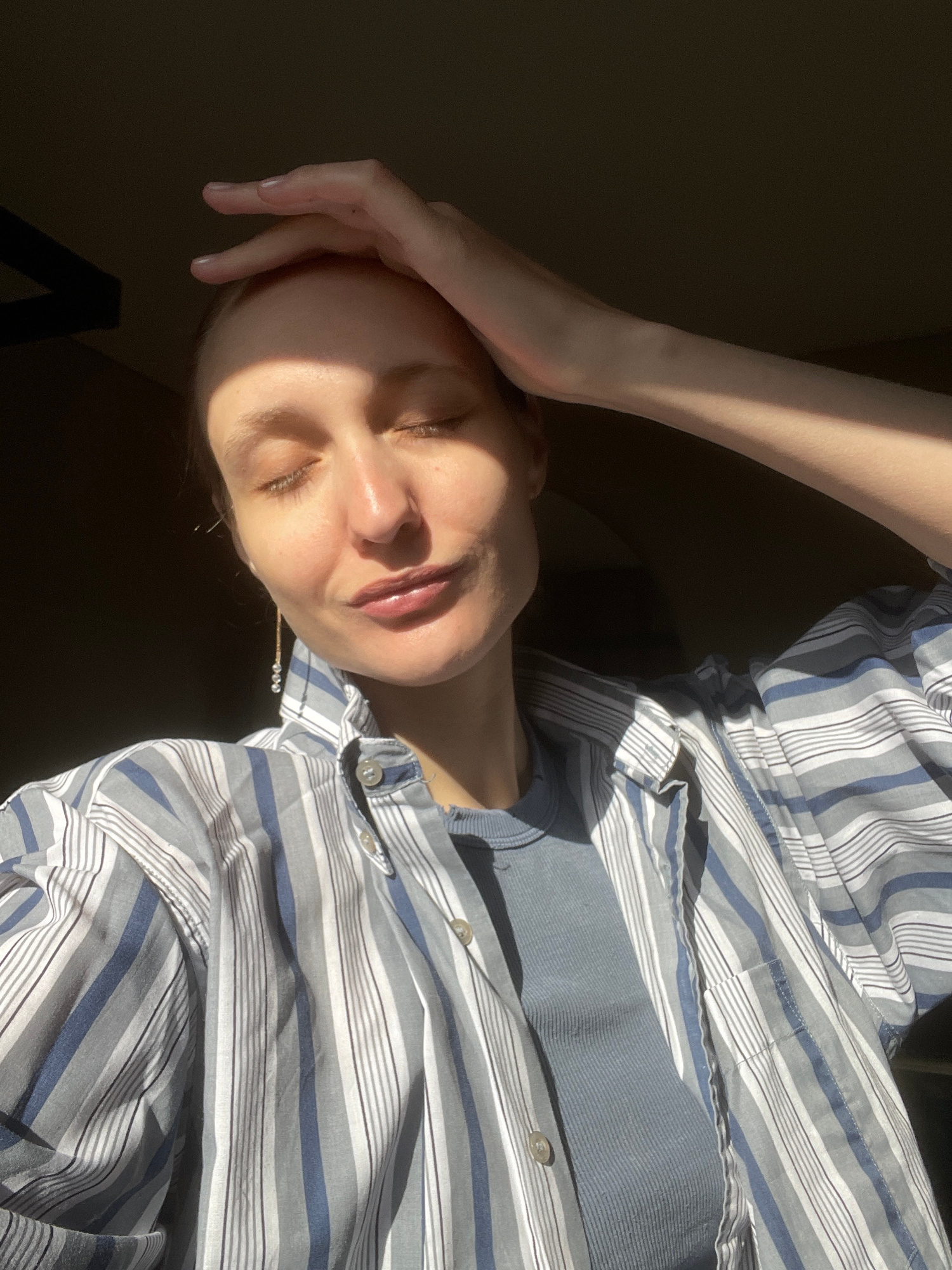 A person with light skin is lying down, their eyes closed, with their hand resting on their forehead. They are wearing a striped shirt with a button-down collar. The image is split into light and shad…read more