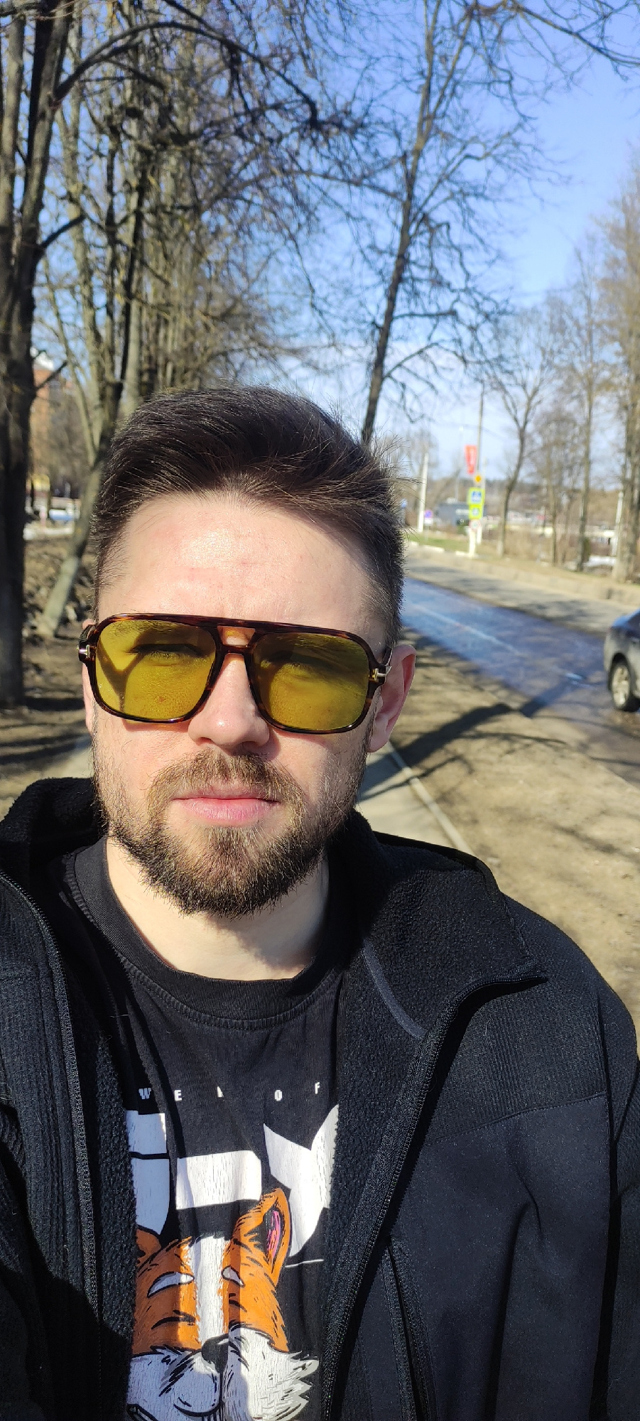 The photograph captures a close-up, angled shot of a man wearing tinted sunglasses, a black hoodie, and a black t-shirt with a graphic featuring a stylized fox and the words "WE LOVE OF" on it. The en…read more
