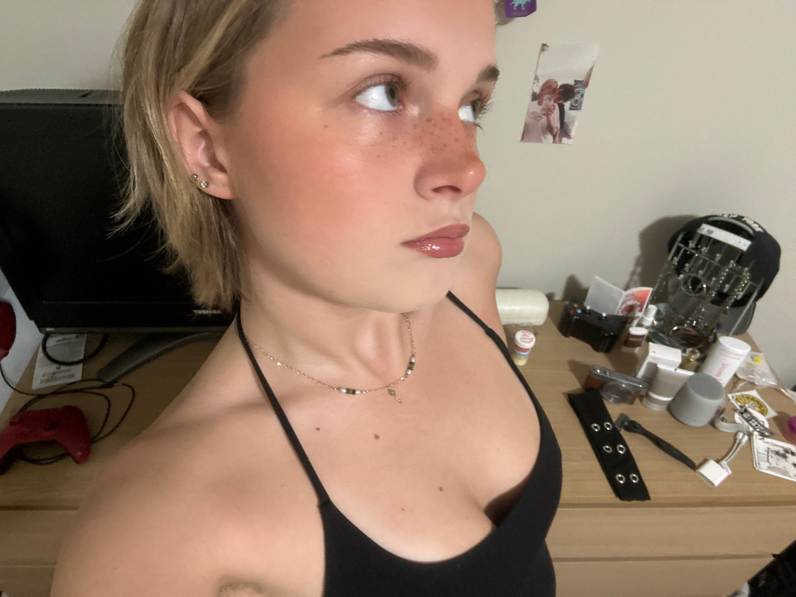 A selfie-style image shows a light-skinned person wearing a black tank top. The image is rotated 180 degrees, making the person appear upside down. The person has freckles and blonde hair. A delicate…read more
