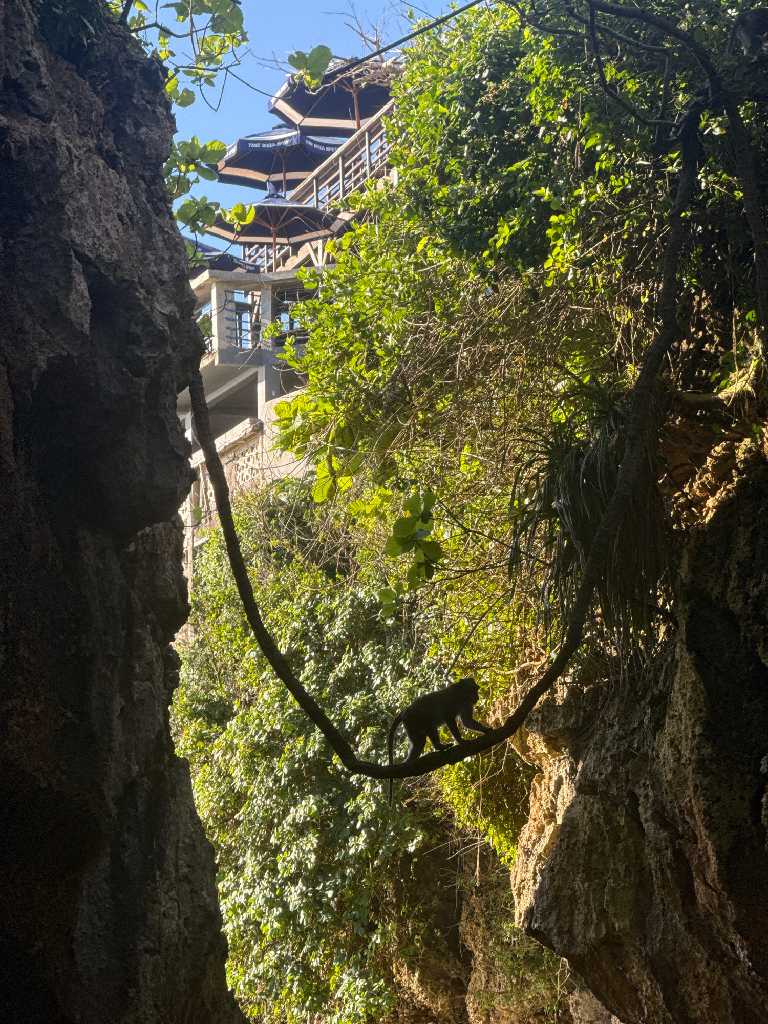 This upward-angled photograph captures a dynamic blend of nature and human presence, likely taken from within a cave or beneath a rock overhang. The foreground is dominated by dark, rugged rock format…read more